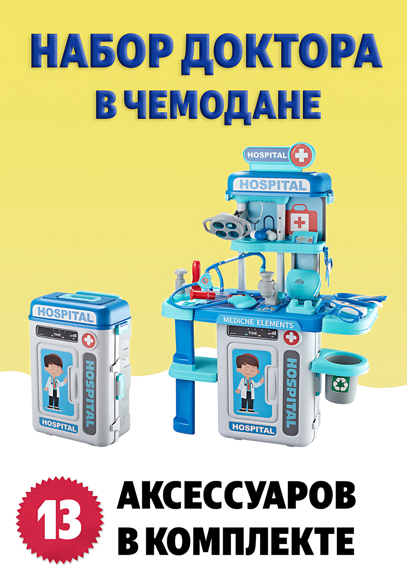 Набор доктора детский большой, 13 аксессуаров, со светом и звуком, 90х32х76 см, голубой