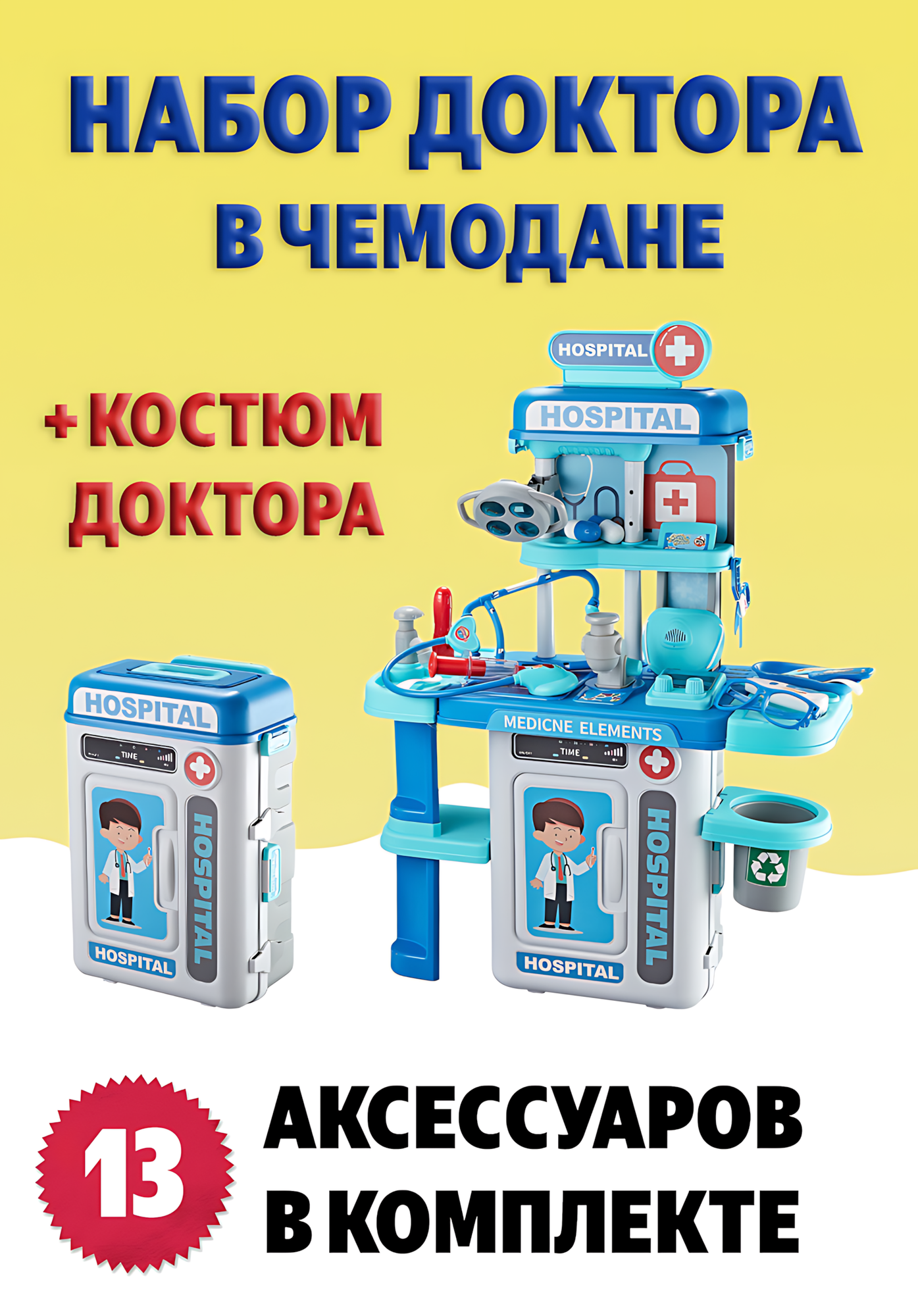 СохранитьНабор доктора детский в чемодане, 13 аксессуаров + костюм врача, со светом и звуком, 52х24х76 см, голубой интересное: