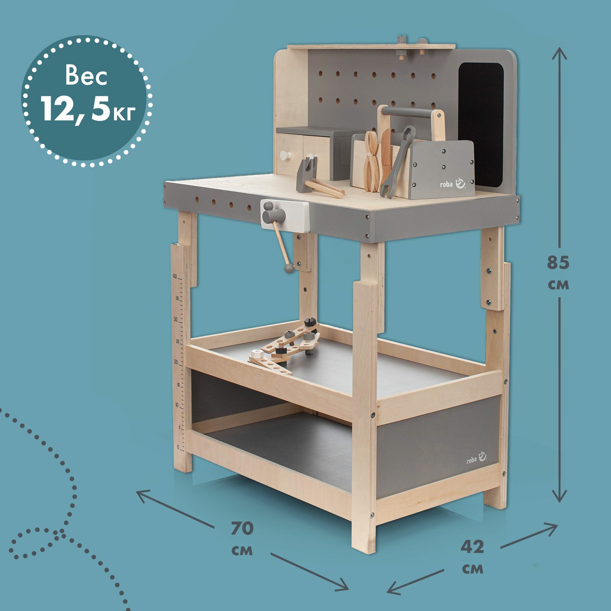 Детская мастерская с инструментами Roba, деревянный верстак с регулируемой высотой, серый интересное: