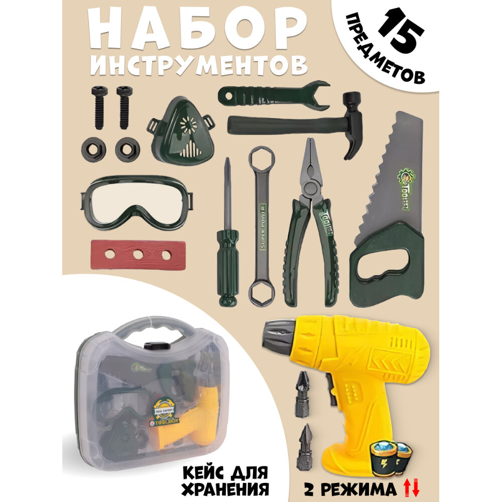 Детский набор игрушечных строительных инструментов с шуруповертом для мальчика, 15 предметов в чемодане интересное: