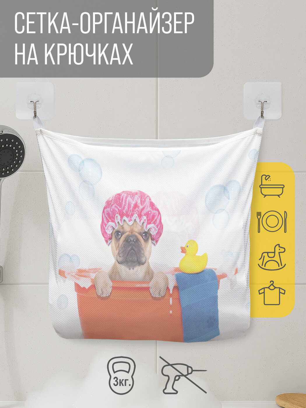 СохранитьСетка для игрушек в ванную "Пес в ванной" органайзер для хранения, крючки, 33x39 см, JoyArty интересное: