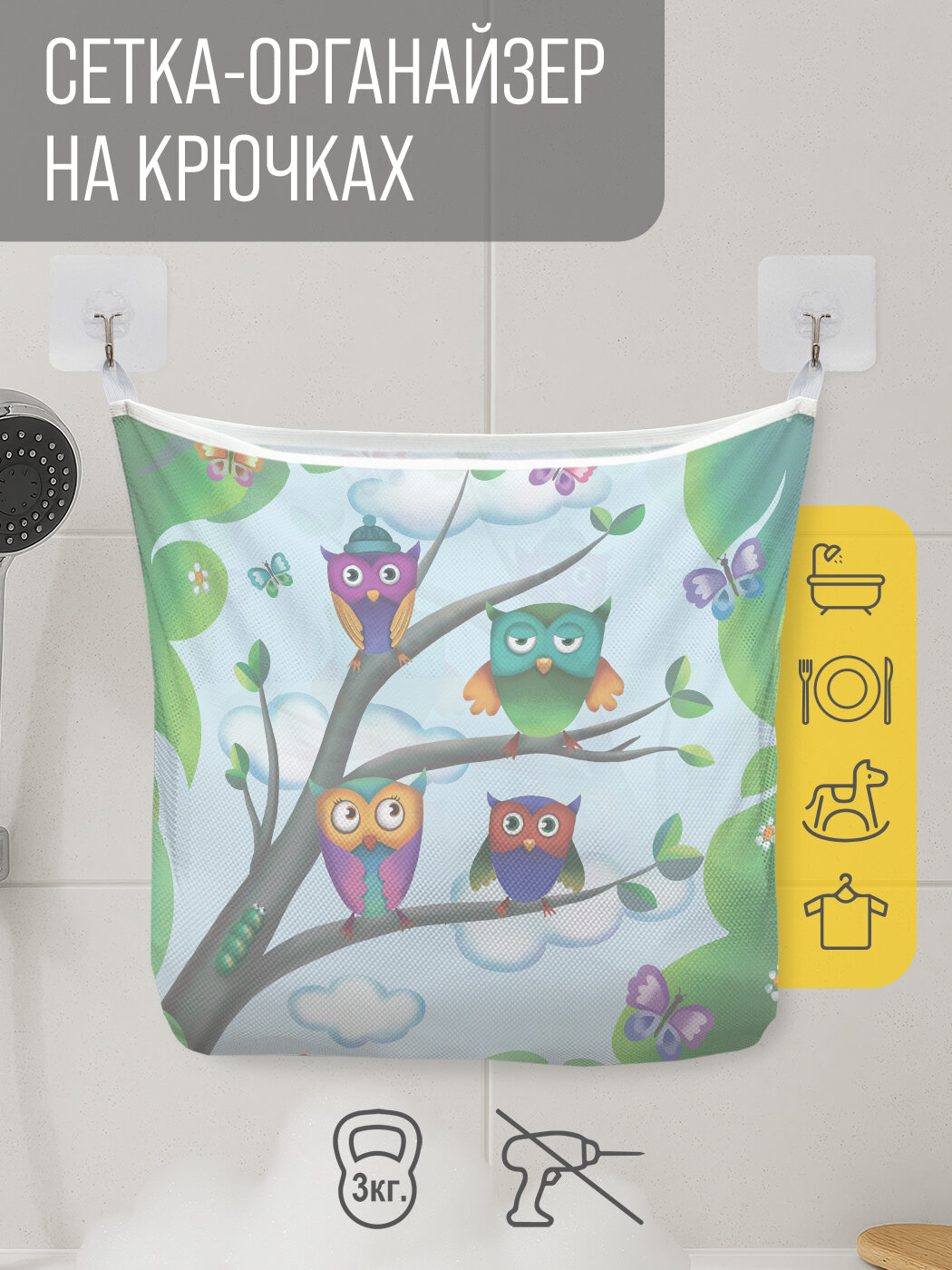 СохранитьСетка для игрушек в ванную "Совы на ветках" органайзер для хранения, крючки, 33x39 см, JoyArty интересное: