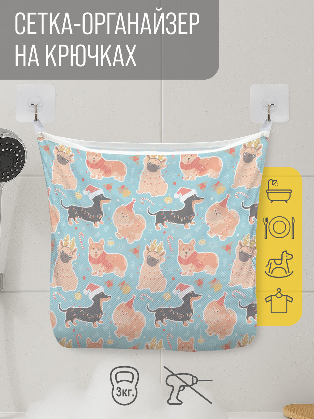 Купить Сетка для игрушек в ванную "Собачья вечеринка" органайзер для хранения, крючки, 33x39 см, JoyArty, серия Новый год