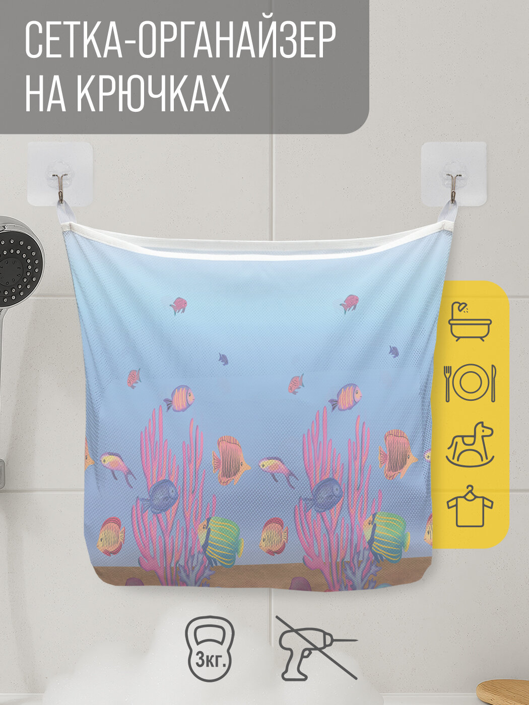 Сетка для игрушек в ванную "Морской мир" органайзер для хранения, крючки, 33x39 см, JoyArty интересное:
