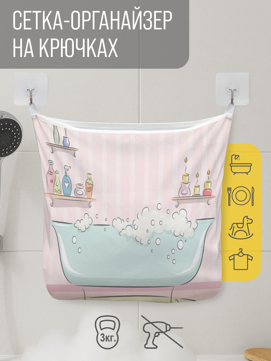 Сетка для игрушек в ванную "Пенная ванна" органайзер для хранения, крючки, 33x39 см, JoyArty интересное: