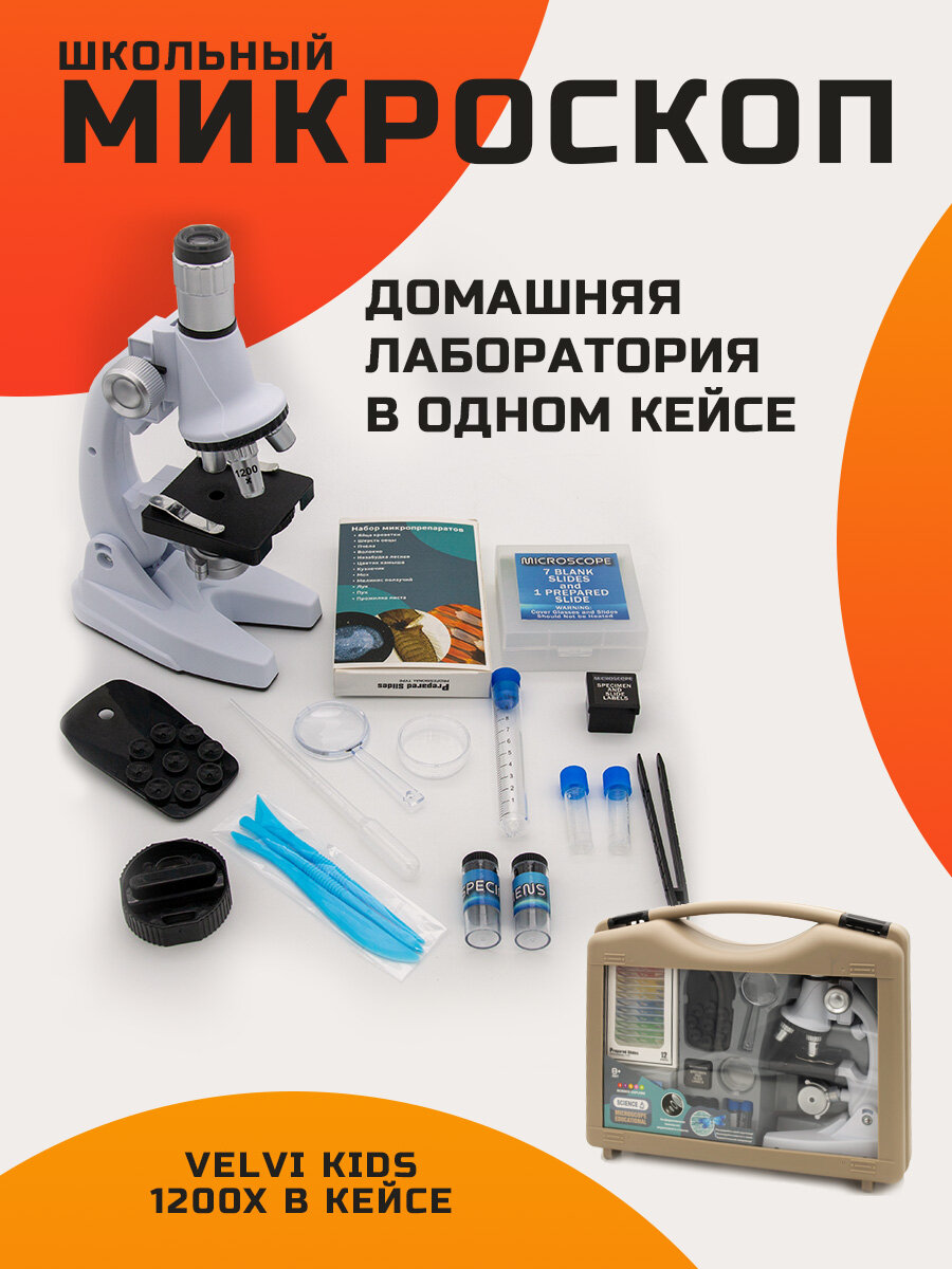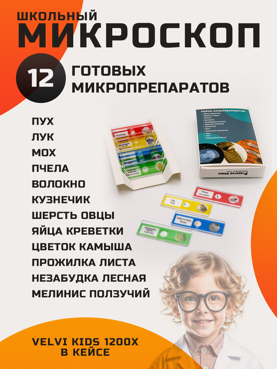 Микроскоп школьный детский Velvi 1200х, в комплекте с 4D книгой и препаратами Velvi "Mix №12"