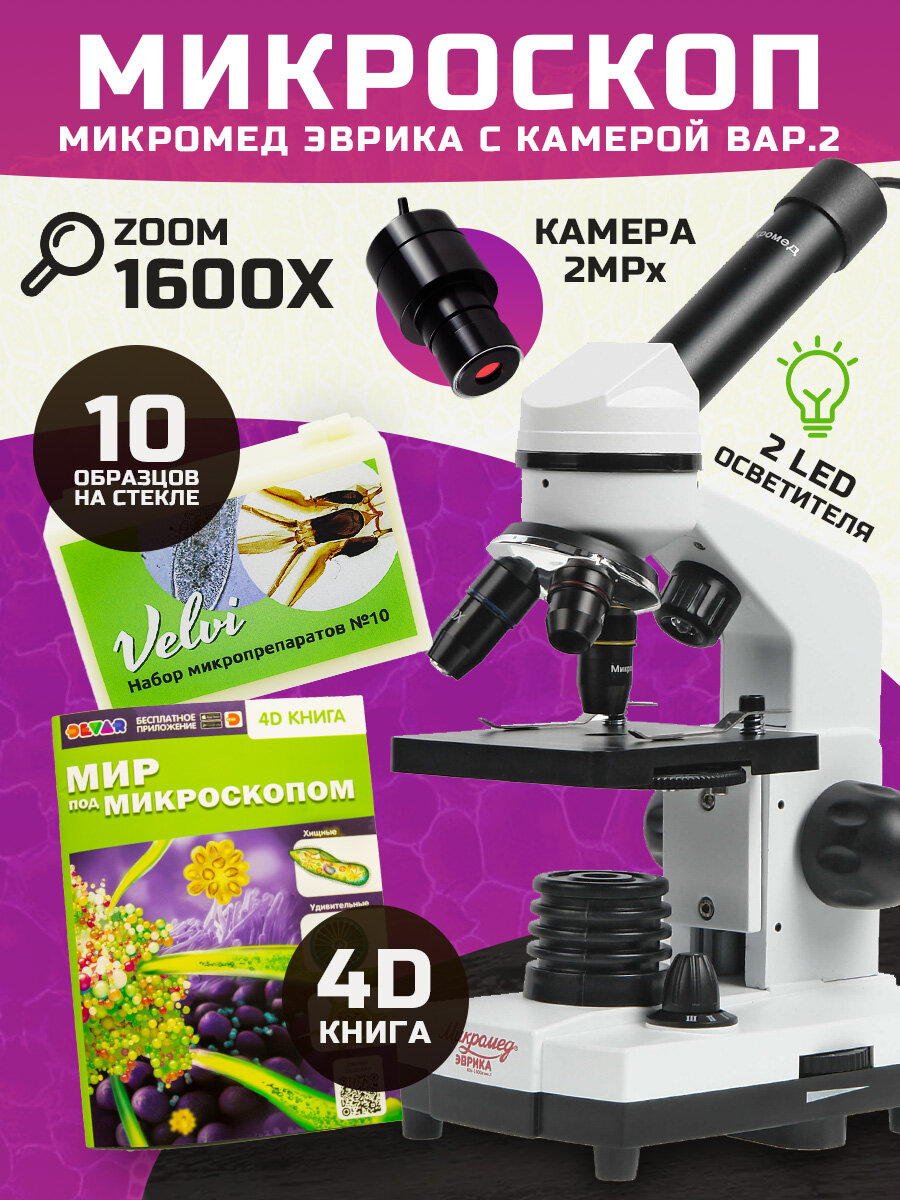 Микроскоп Микромед "Эврика" 40x-1600x, с видеоокуляром, 4D книгой и препаратами Velvi №10 интересное: