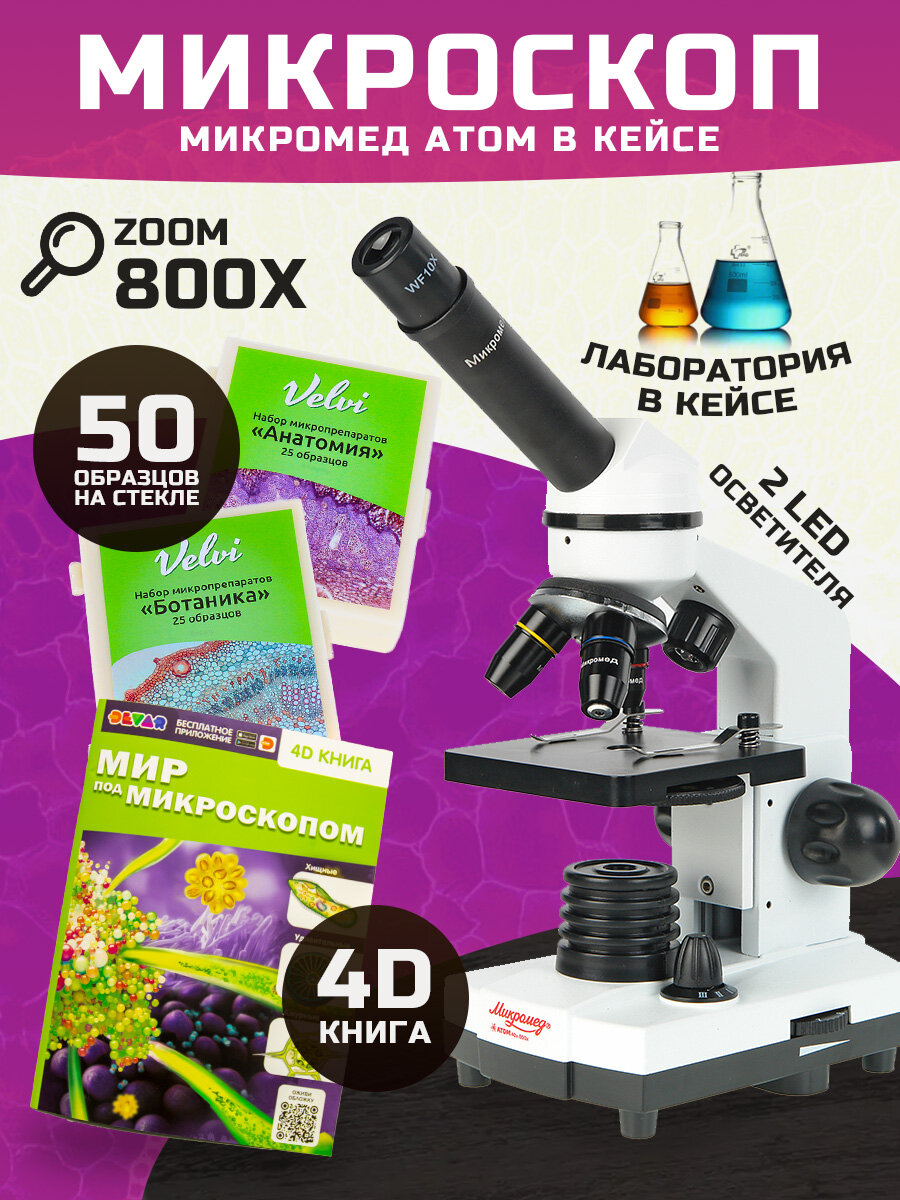 Микроскоп Микромед "Атом" 40х-800х, в кейсе с 4D книгой и набором препаратов Velvi №10