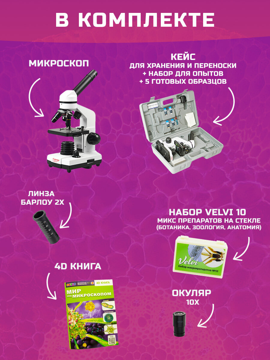 Купить Микроскоп Микромед "Атом" 40х-800х, в кейсе с 4D книгой и набором препаратов Velvi №10