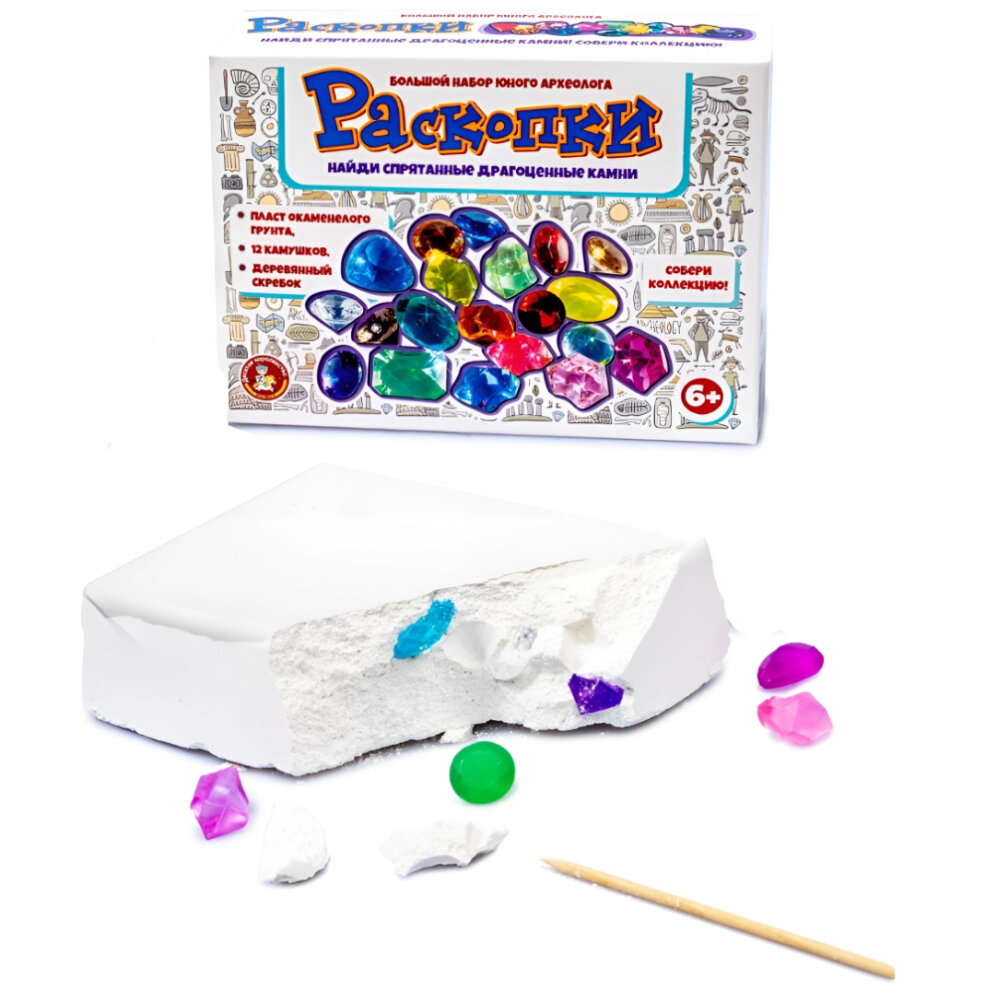 Купить Набор археолога раскопки кристаллов для детей 12,5 х 17,5 х 5 см гипсовая основа, деревянный скребок, 12 камней, 04609
