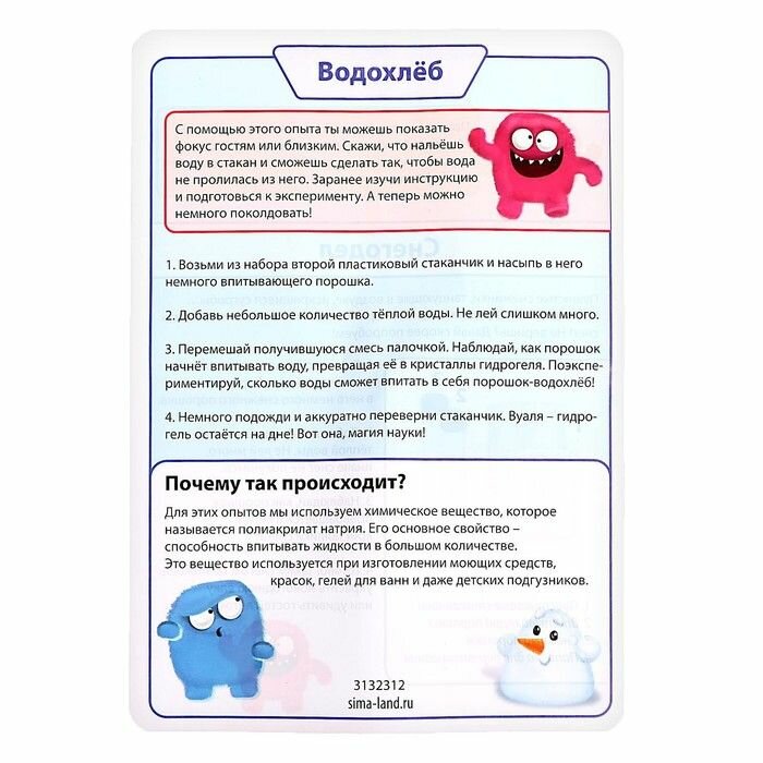 Набор для опытов "Водохлёб и снег", простые эксперименты в домашних условиях, сделай сам, химия для детей, юный ученый интересное:
