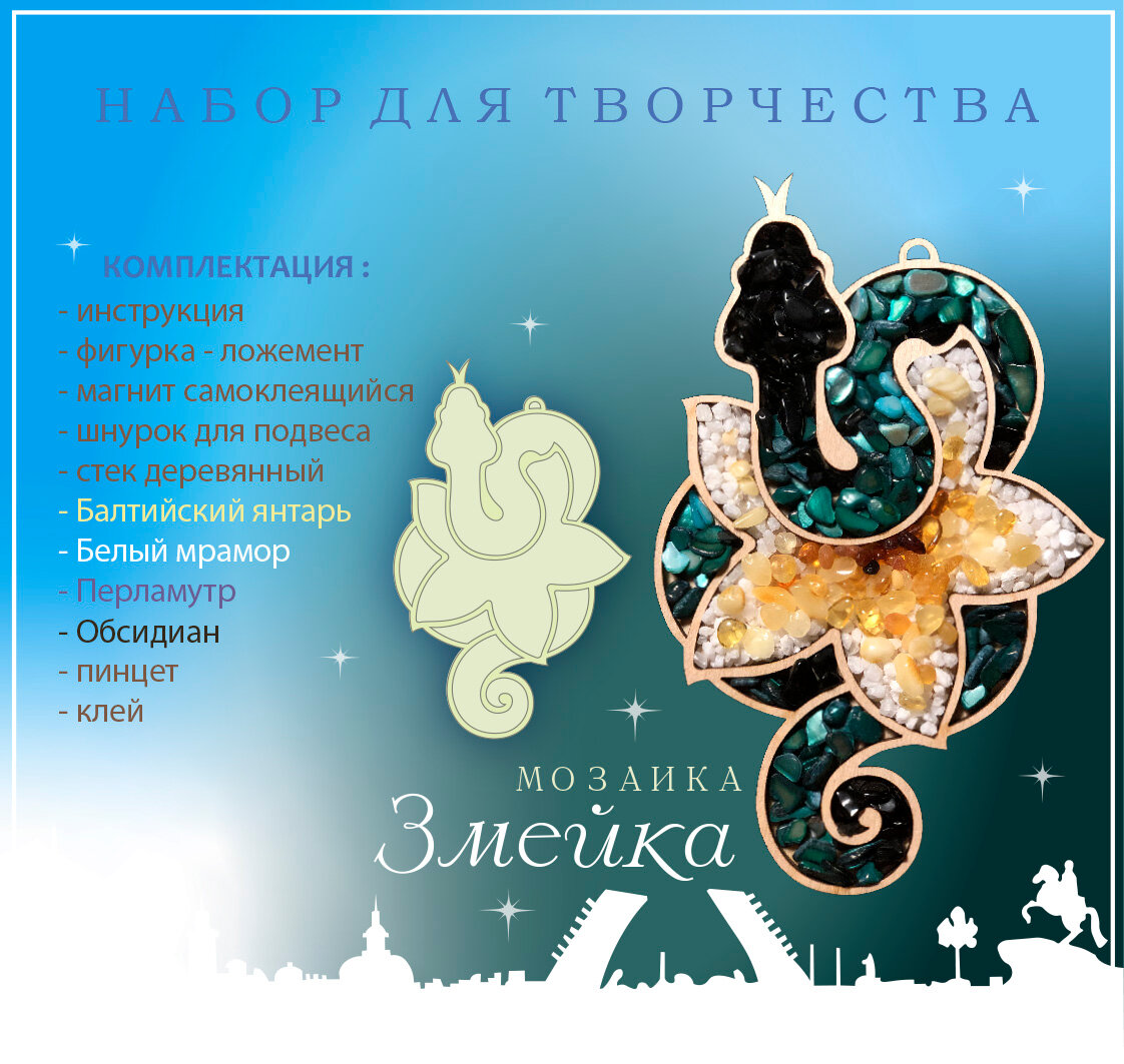 Набор для творчества, мозаика "Змейка " 12.5х8 см. балтийский янтарь, обсидиан, белый мрамор, перламутр интересное: