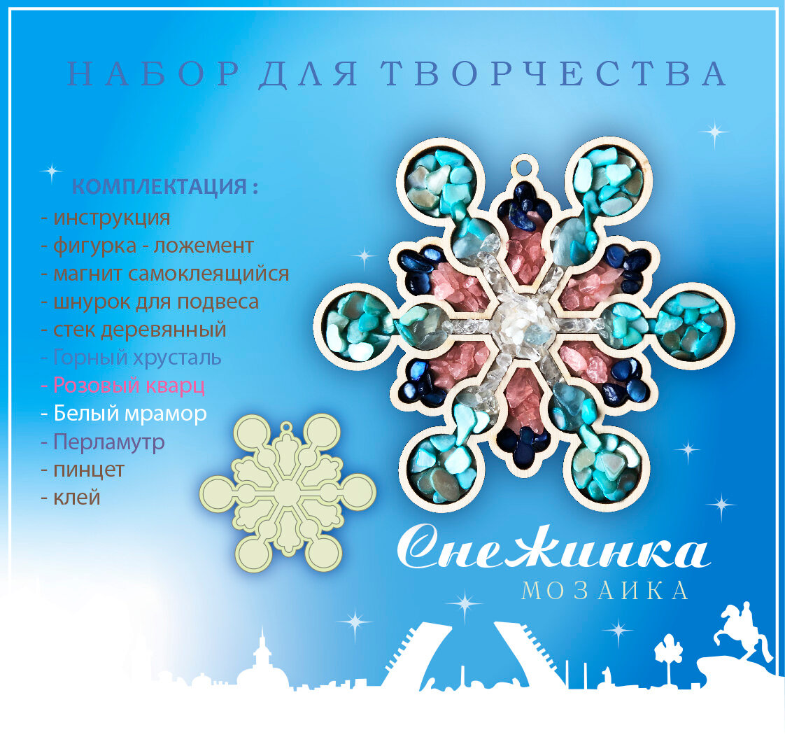 Набор для творчества, мозаика "Снежинка " 9х10 см. горный хрусталь, розовый кварц, белый мрамор, перламутр интересное: