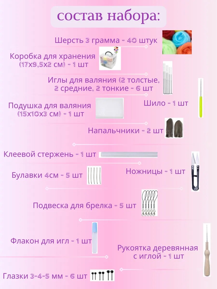 СохранитьНабор для самостоятельного валяния Magia Hobby 40 цветов шерсти, шерсть, иглы, подставка, интересное:
