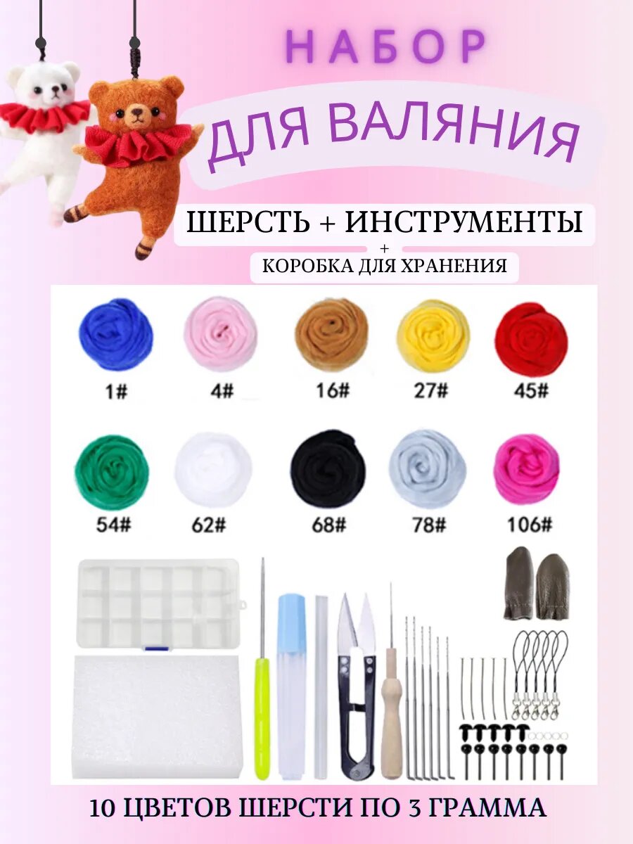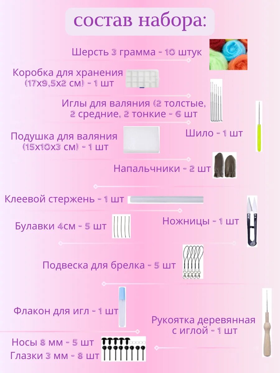СохранитьНабор для самостоятельного валяния Magia Hobby 10 цветов, шерсть, иглы, подставка интересное: