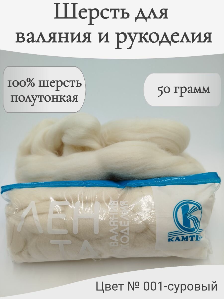 Лента для валяния полутонкая Камтекс, 100% шерсть, 50 г (001 суровый)