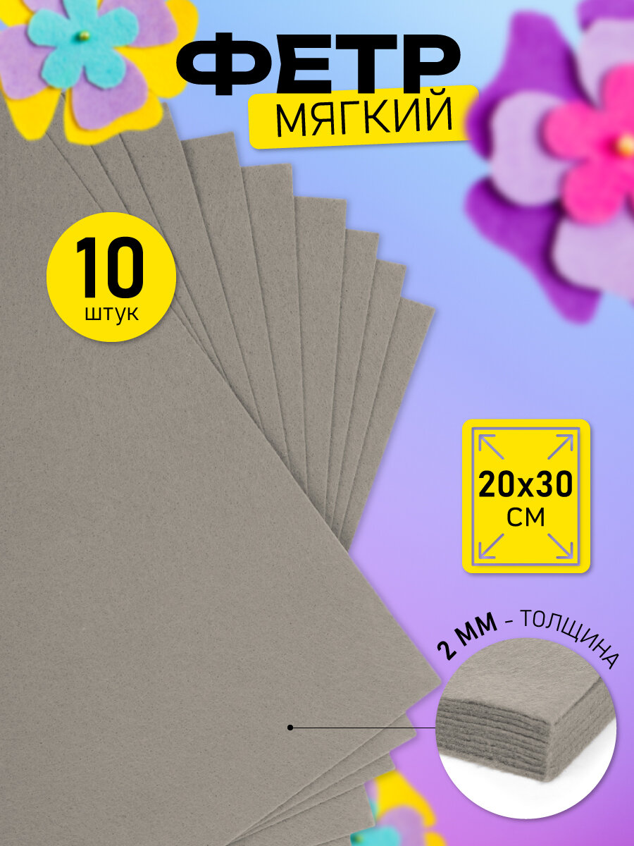 Фетр листовой мягкий Magic 4 Hobby 2мм 20х30см арт. FLT-S2 уп.10 листов цв.648/102 св. серый интересное: