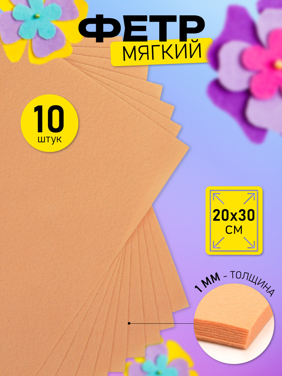 Купить Фетр листовой мягкий Magic 4 Hobby 1мм 20х30см арт. FLT-S1 уп.10 листов цв.652/100 персик
