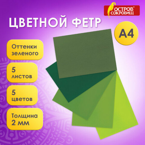 Купить Цветной фетр для творчества А4 210*297мм BRAUBERG 5л, 5цв, толщ. 2мм, оттенки зеленого, 660643 660643