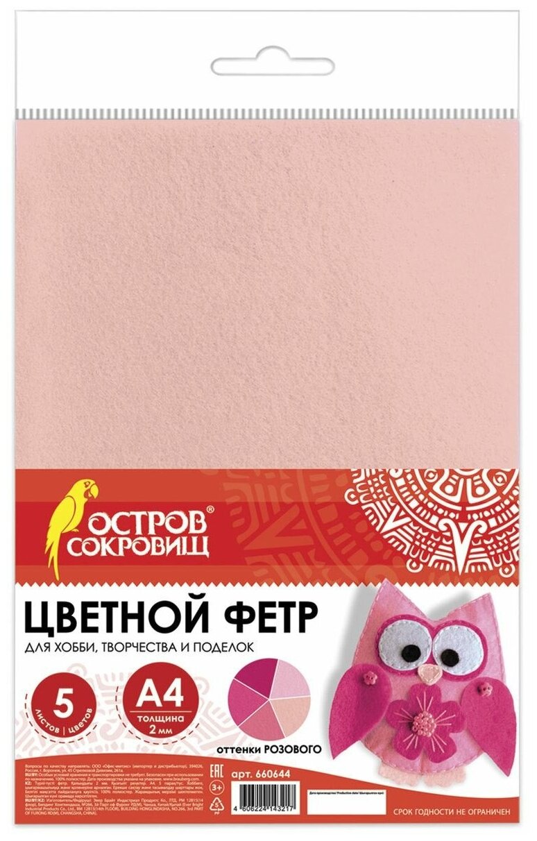 Ниже Вы можете прочитать отзывы на Цветной фетр для творчества, А4, остров сокровищ, 5 листов, 5 цветов, толщина 2 мм, оттенки розового, 660644 (арт. 660644), ознакомится с подробными характеристиками, посмотреть интересные обзоры и фотографии на Цветной фетр для творчества, А4, остров сокровищ, 5 листов, 5 цветов, толщина 2 мм, оттенки розового, 660644 (арт. 660644).