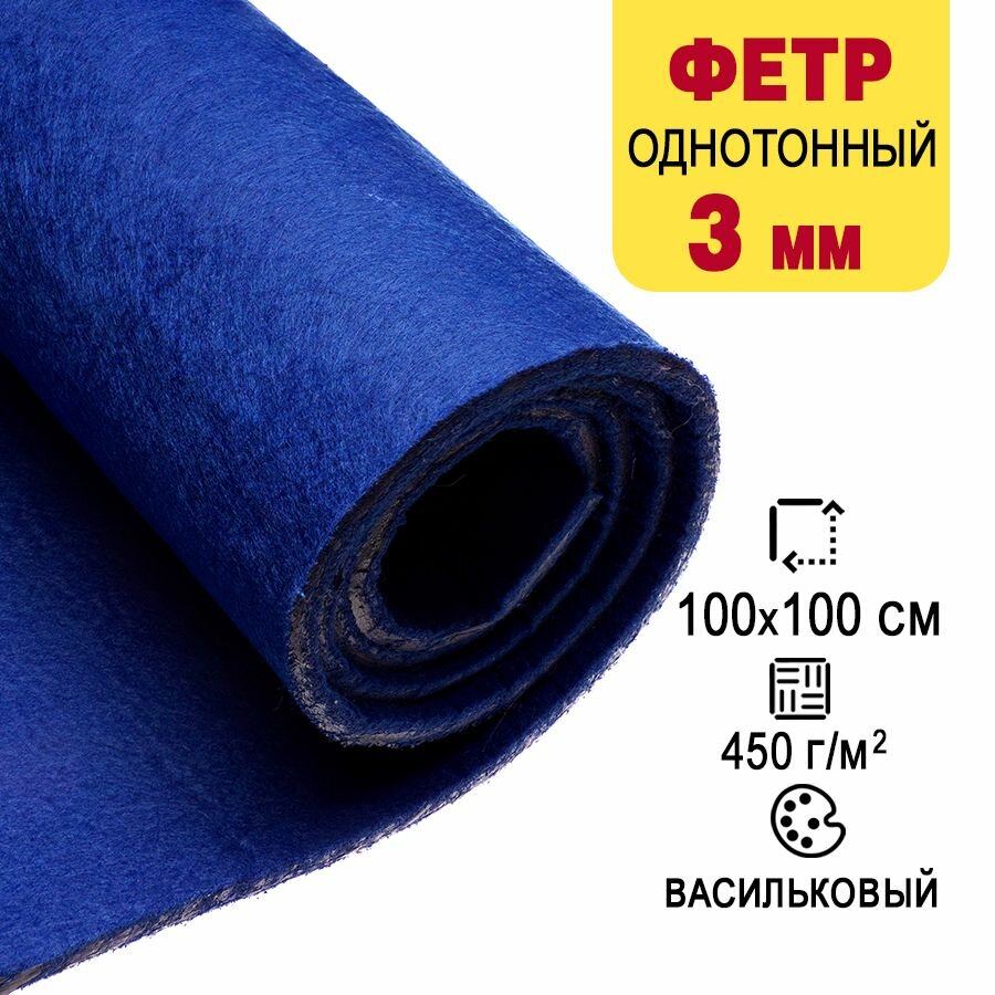 Купить Фетр однотонный твердый 3 мм в рулоне, 100 х 100 см, васильковый С63, плотность 450 г/м2