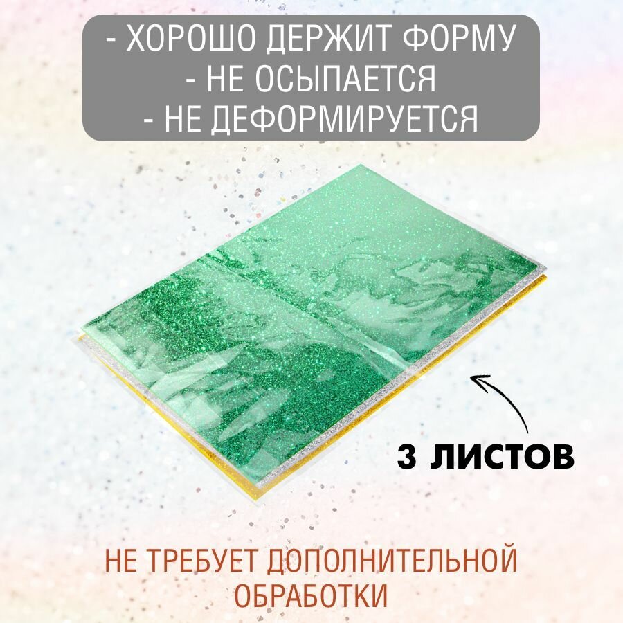 Фетр однотонный твердый глиттерный 2 мм / 200 х 300 мм (зеленый, золото, серебро), 3 листа интересное: