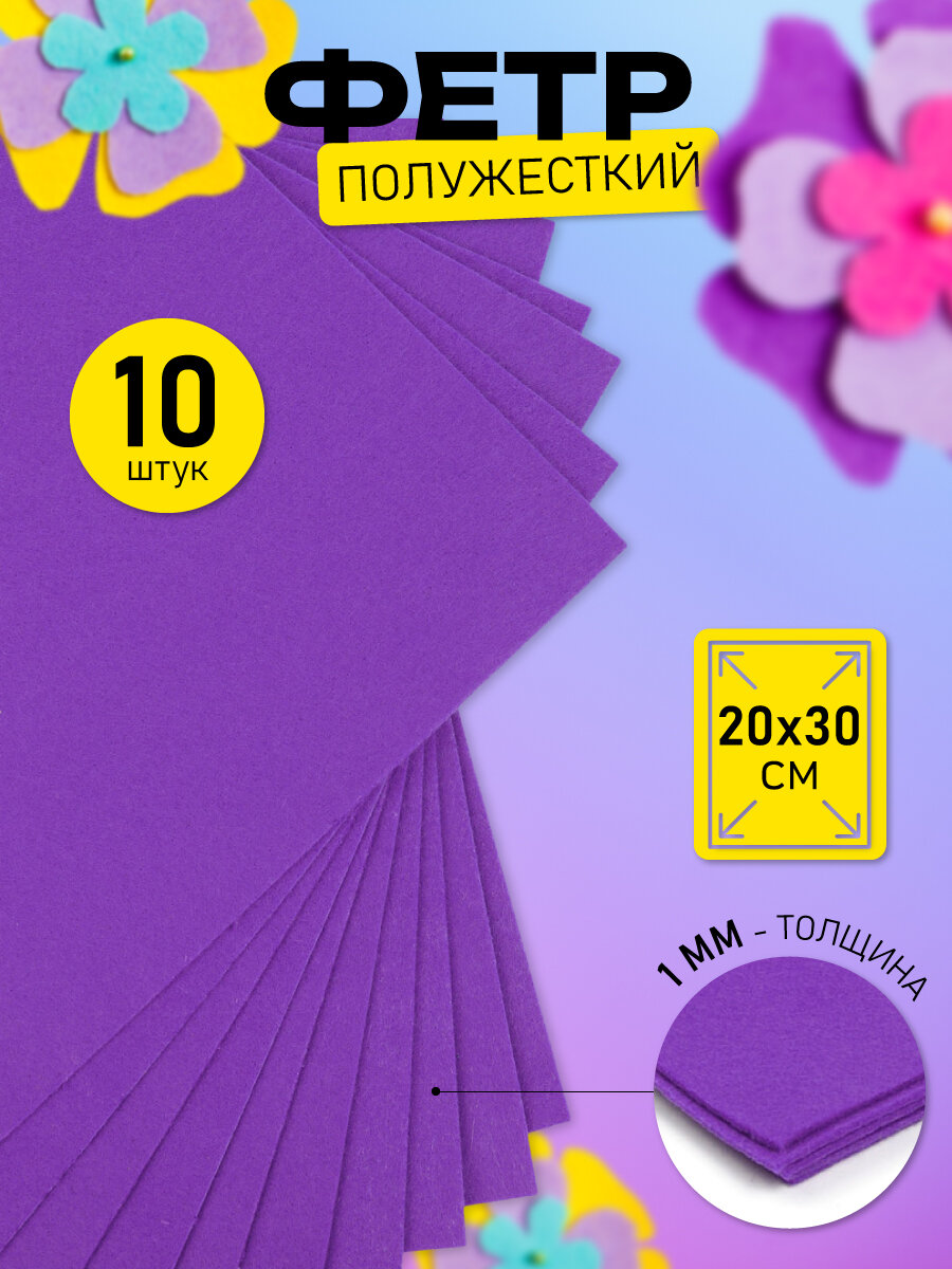Фетр листовой полужесткий IDEAL 1мм 20х30см арт. FLT-HS1 уп.10 листов цв.114 фиолетовый интересное: