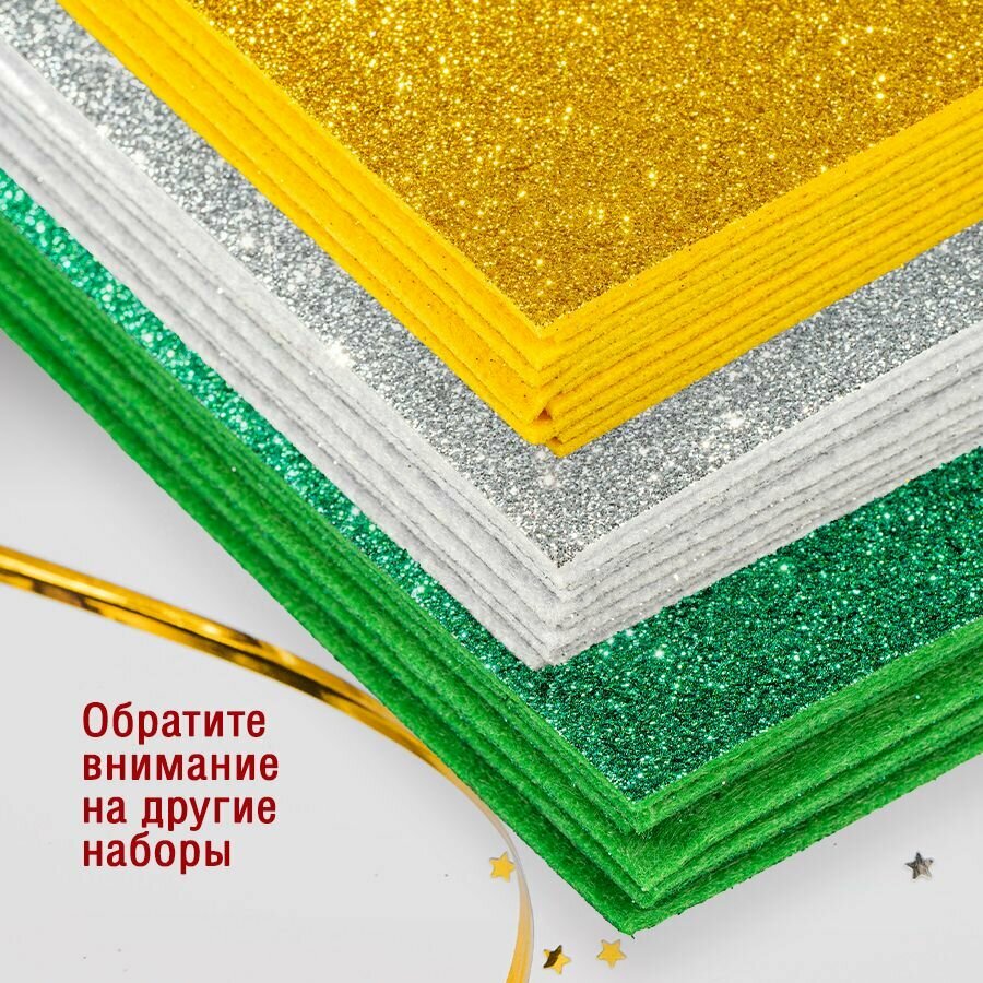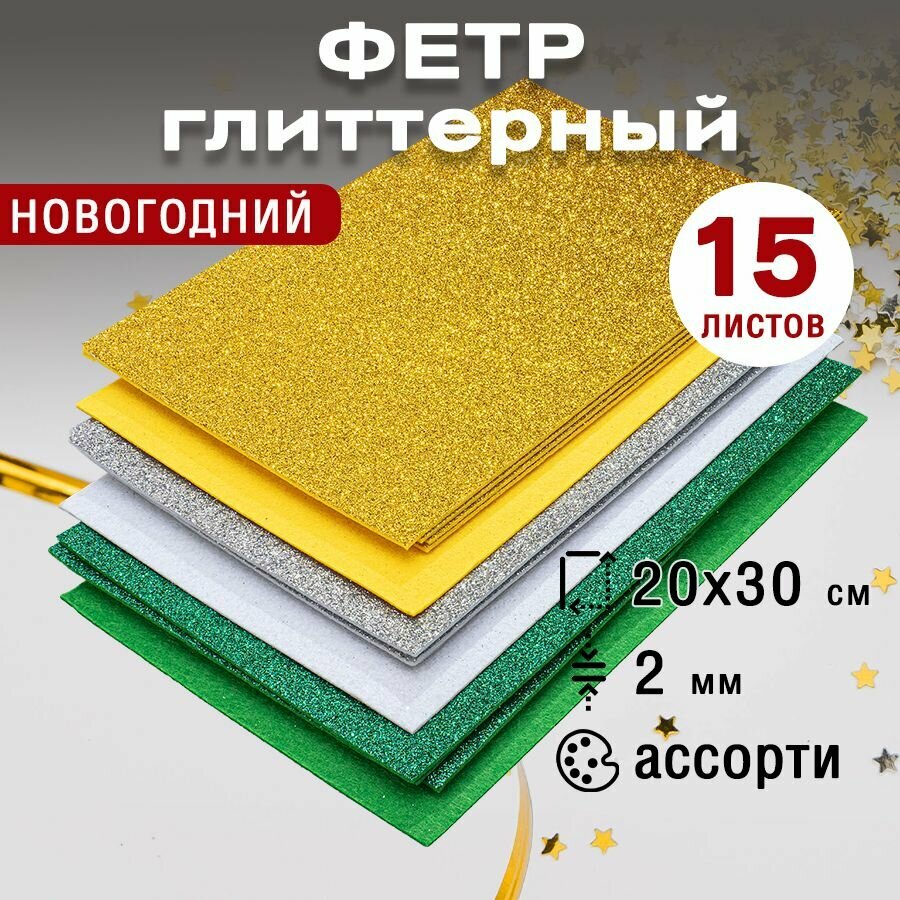Фетр однотонный жесткий глиттерный 2 мм / 200 х 300 мм (ассорти 15 шт) интересное: