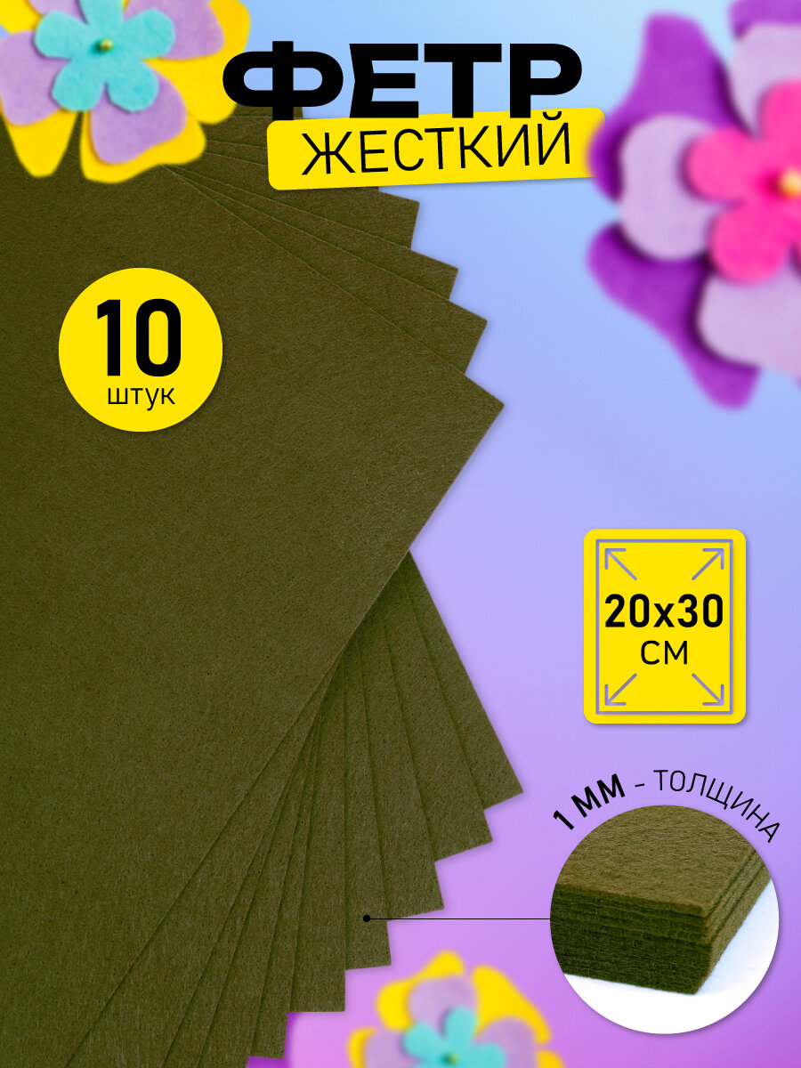 Фетр листовой жесткий IDEAL 1мм 20х30см арт. FLT-H1 уп.10 листов цв.663 болотный интересное: