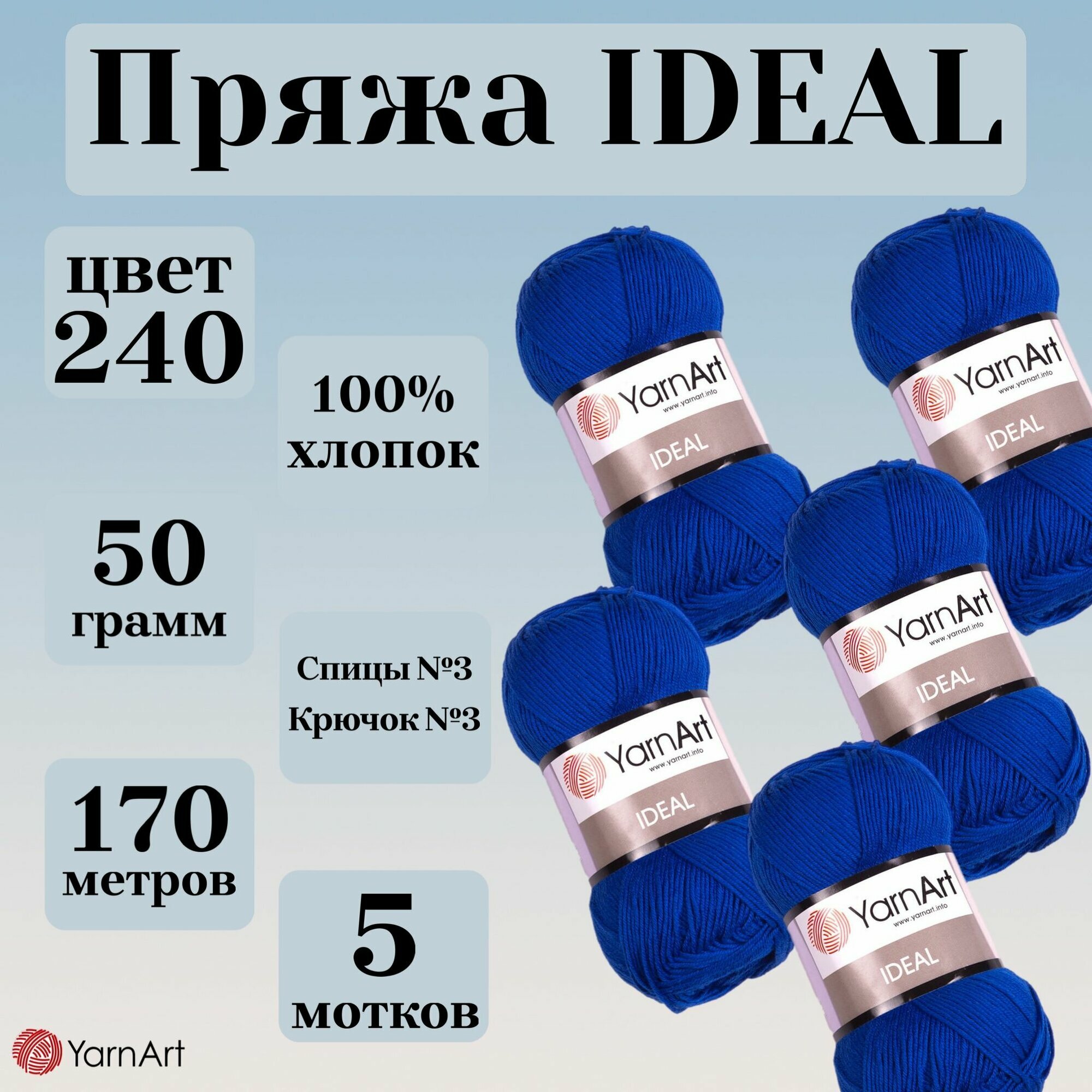 Натуральная летняя пряжа Ideal YarnArt, цвет 239 ярко-голубой, моток 50г, 170м, 5 мотков