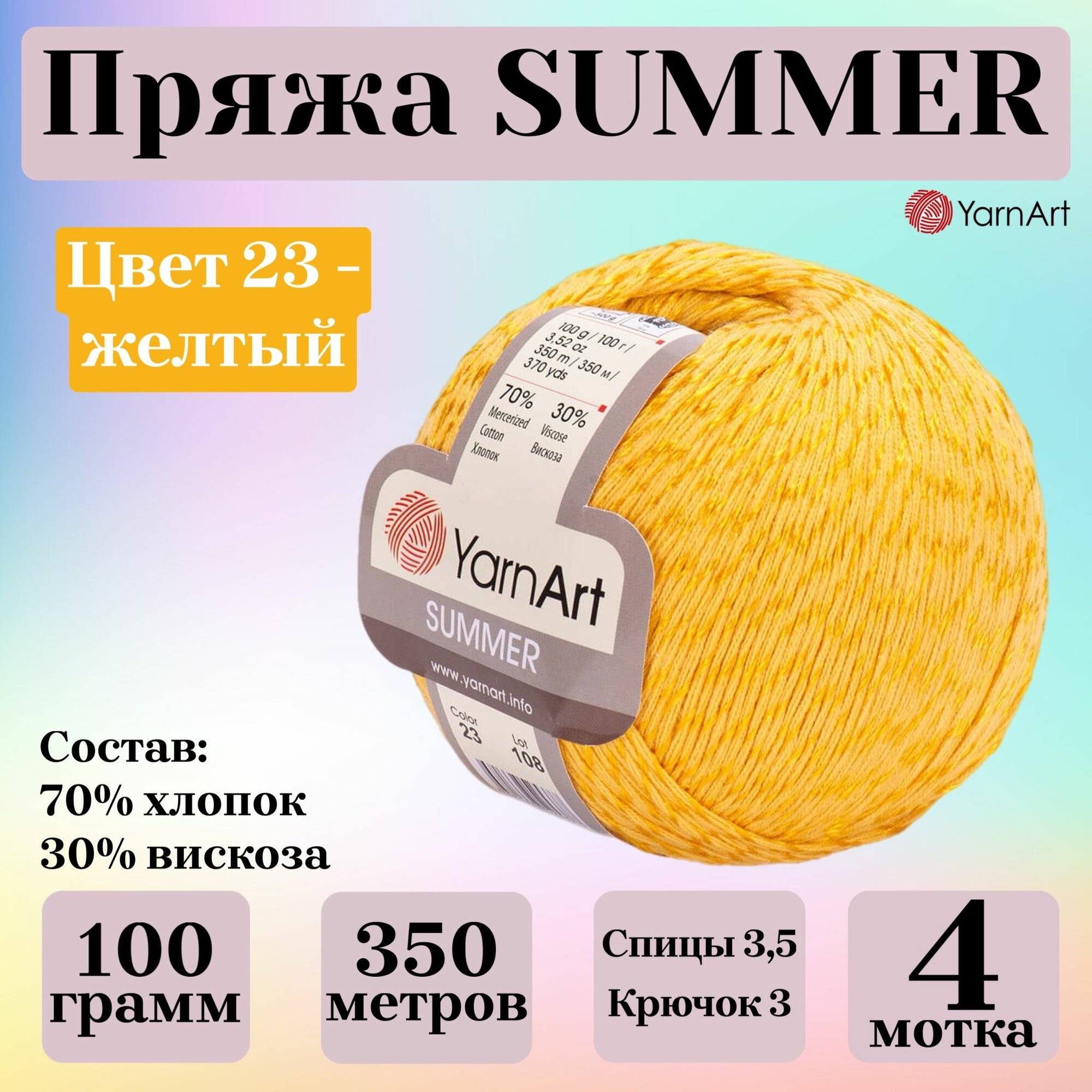 Купить Пряжа для вязания YarnArt Summer, цвет 23 желтый, моток 100г, 350м, 4 мотка