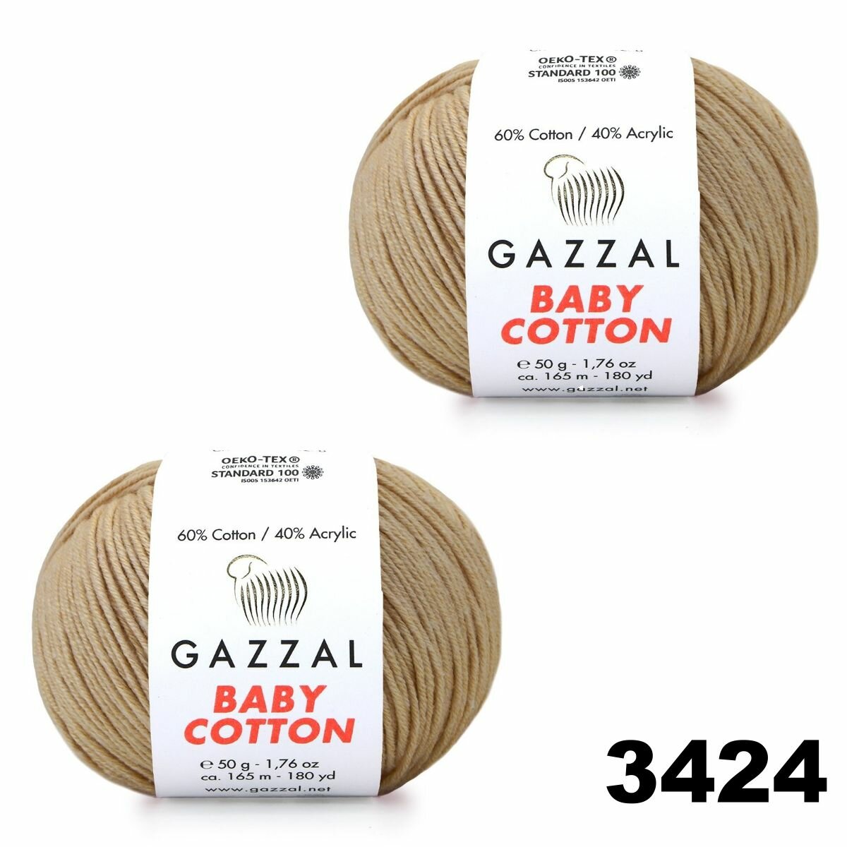 Пряжа для вязания GAZZAL BABY COTTON (Газзал Бейби Коттон) / цвет 3464 - Лён (партия 260450) / 2шт / 165м/50г, хлопок 60%, акрил 40%