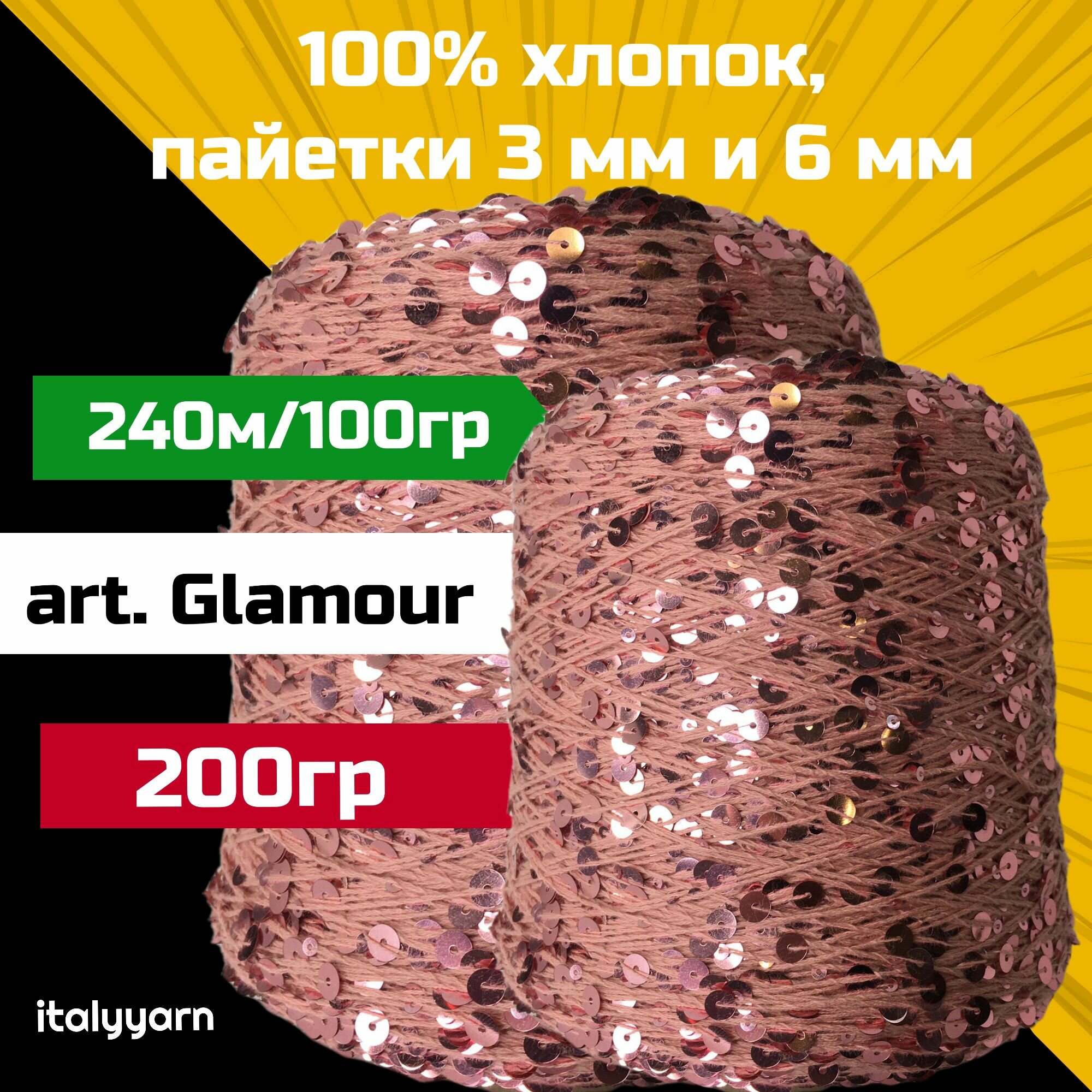 GLAMOUR; пайетки 3мм и 6мм на нити из 100% хлопка; 240м/100гр; вес 100гр; italyyarn