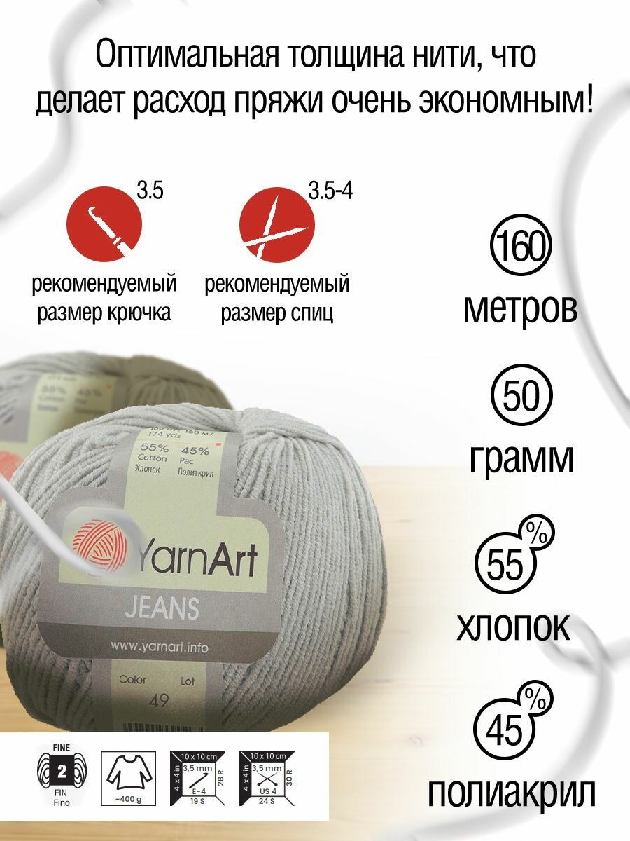 Пряжа YarnArt Jeans, цвет пепельно-серый 49, 1 моток, 50г/160м, состав 45% акрил, 55% хлопок, ярнарт джинс
