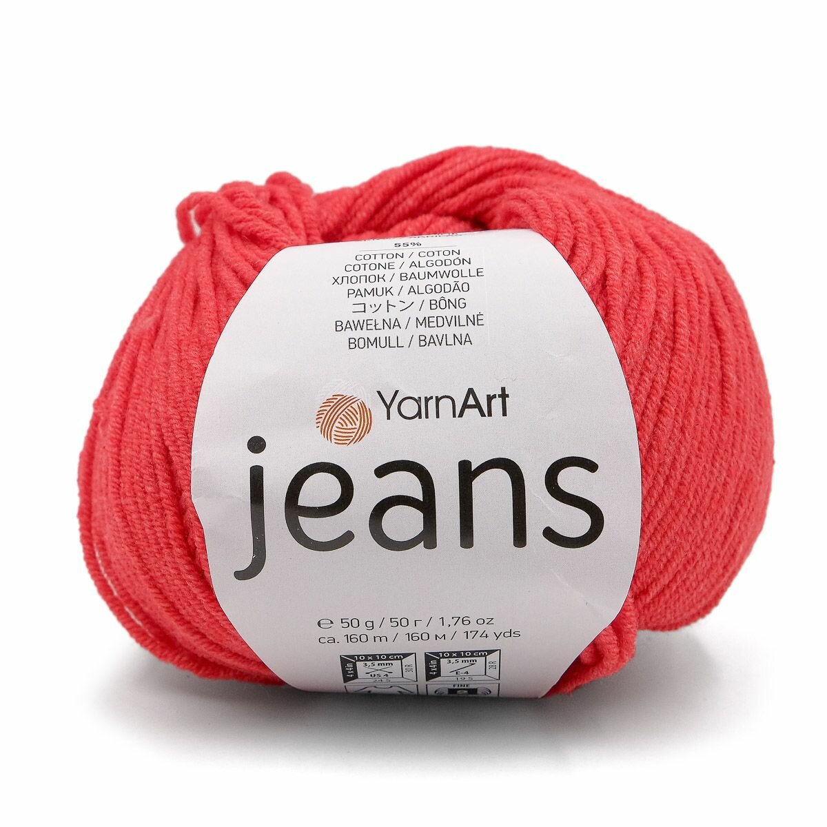 Пряжа YarnArt Jeans, цвет красный коралл 26, 1 моток, 50г/160м, состав 45% акрил, 55% хлопок, ярнарт джинс