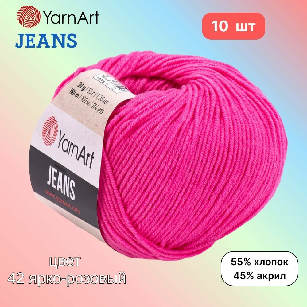Купить Пряжа YarnArt Jeans, цвет ярко-розовый 42, 10 мотков, 50г/160м, состав 45% акрил, 55% хлопок, ярнарт джинс