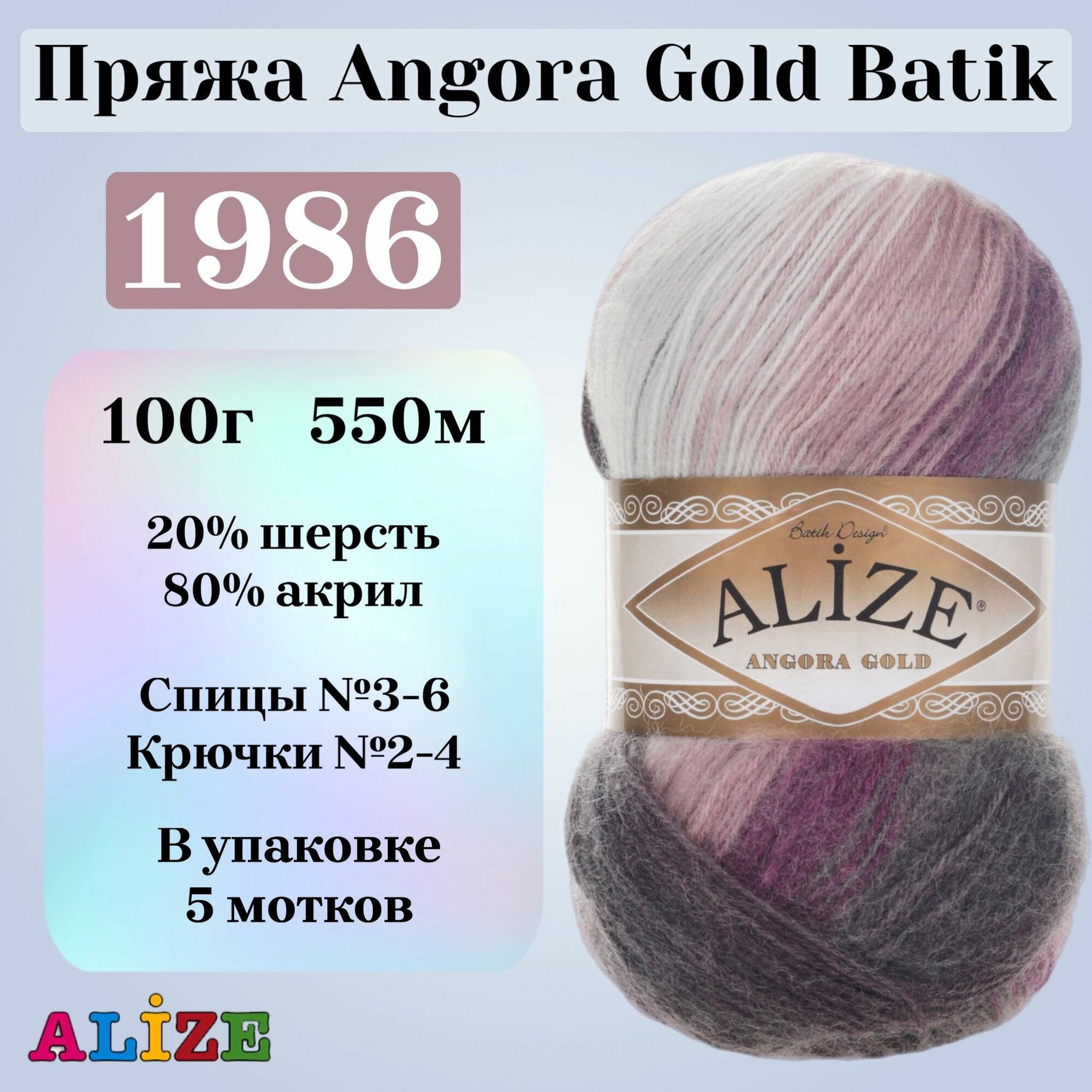 Купить Пряжа для вязания Alize Angora Gold Batik, цвет 1986, 100г, 550м, 5шт/упак