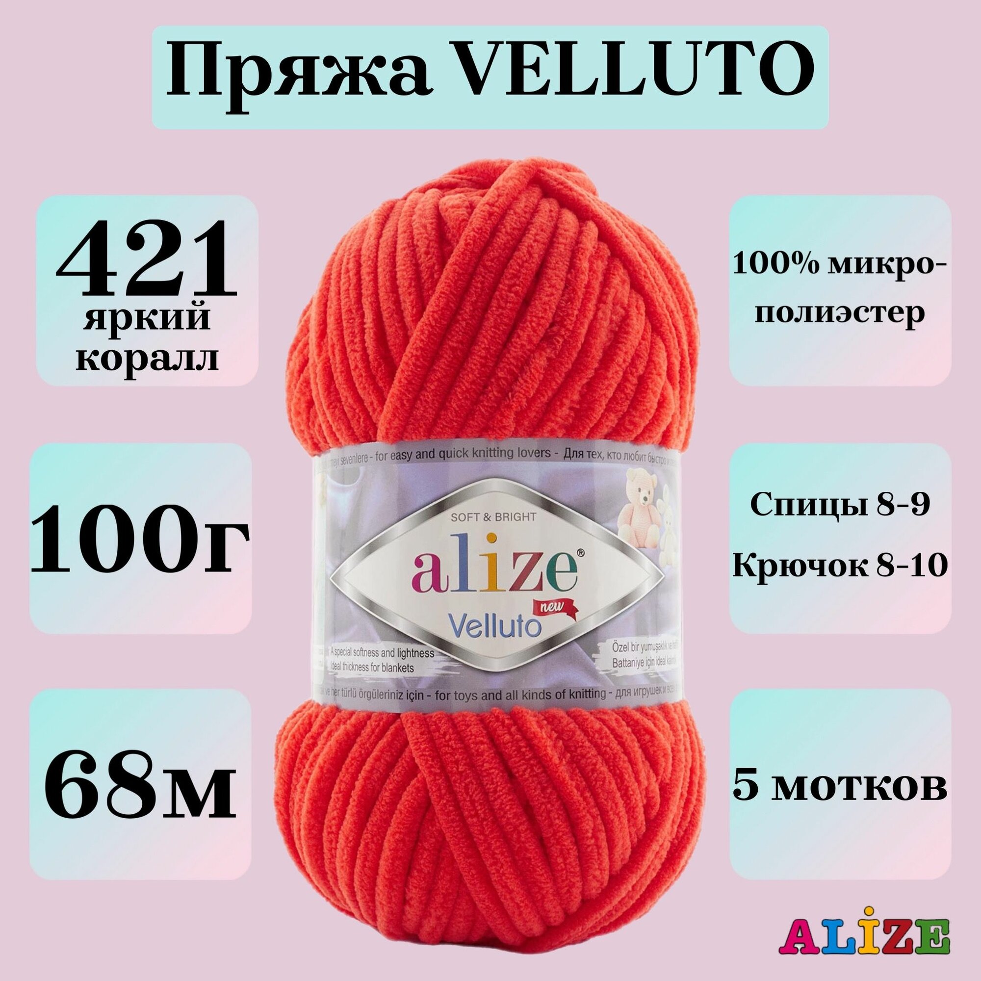 Купить Пряжа для вязания плюшевая Alize Velluto, цвет 421 яркий коралл, 100г, 68м, 5шт/упак