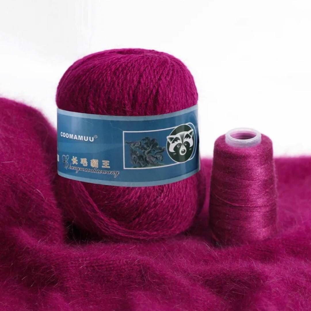 Пряжа пух норки цвет 057-малина , 1 моток+1 катушка дополнительной нити,350м/50гр, 90%пух норки,10%ПА