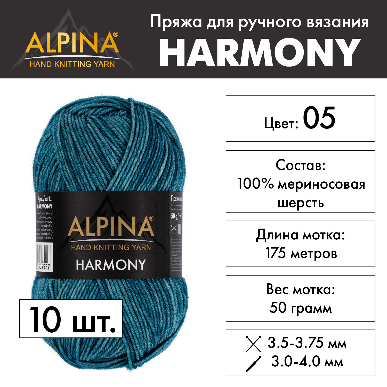 Купить Пряжа Alpina "HARMONY" 10 шт. по 50 г 100% мериносовая шерсть 175 м №05 т. бирюзовый