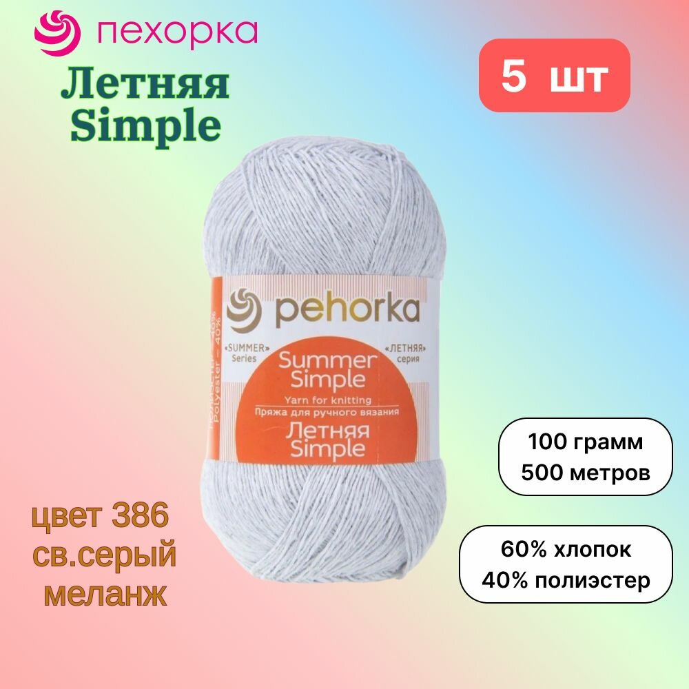 СохранитьПряжа Пехорка Летняя Simple Св. серый меланж (386) 5 мотков 100 г/500 м (60% хлопок, 40% полиэстер) летняя симпл интересное: