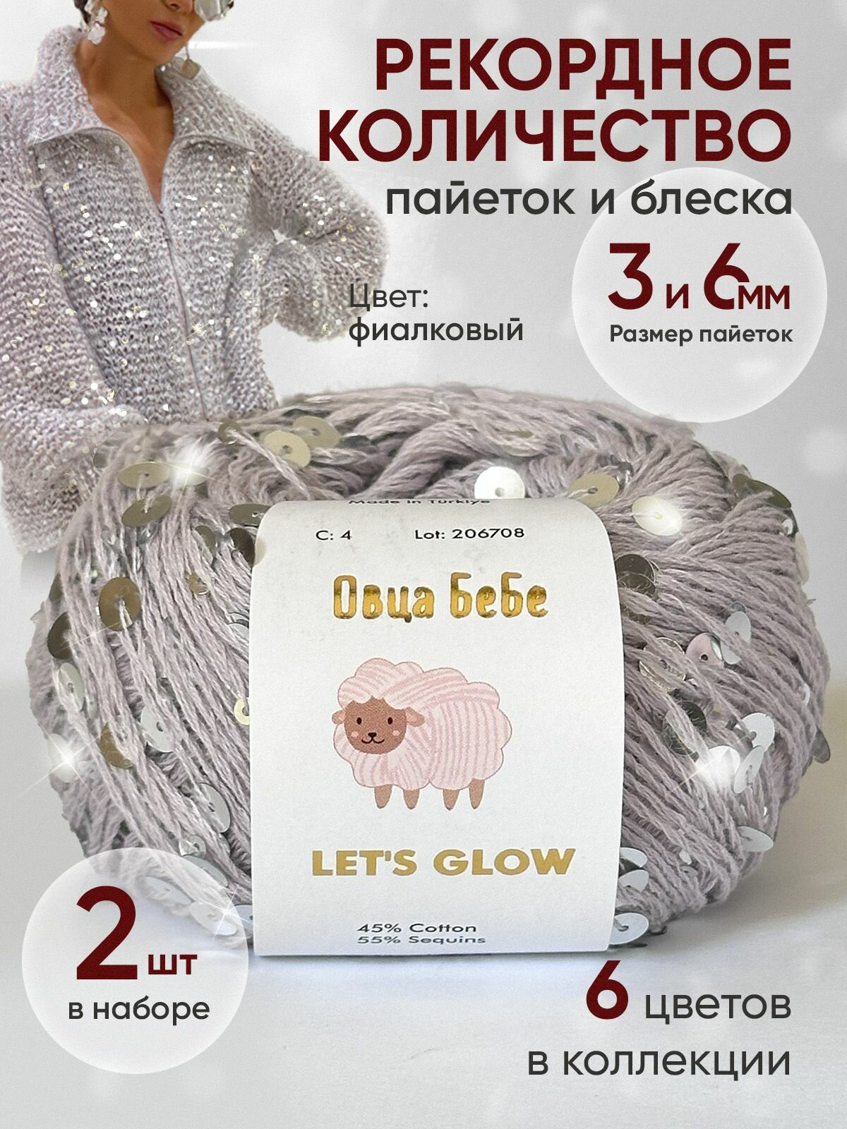 Пряжа Овца БеБе Let's Glow, с пайетками, фиалковая, хлопок, 100г интересное: