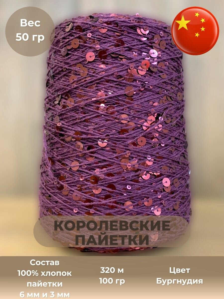 СохранитьКоролевские пайетки на хлопке 6+3 мм, 100% хлопок, 320 м в 100 гр, 50 гр, Бургундия пайетки в тон интересное: