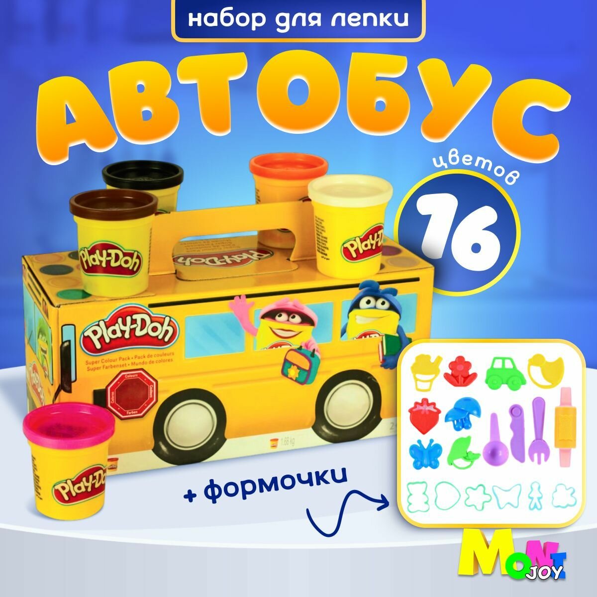 Мягкий пластилин для детей по мотивам Play Doh "Автобус", 16 банок цветов, плей до интересное: