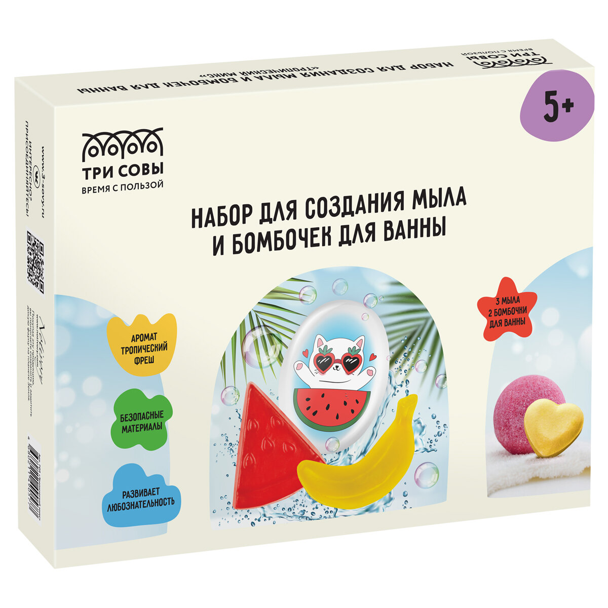 Комплект 3 шт, Набор для мыловарения 5в1 ТРИ совы "Тропический микс", 1 мыло с картинкой, 2 классических мыла, 2 бомбочки картонная коробка