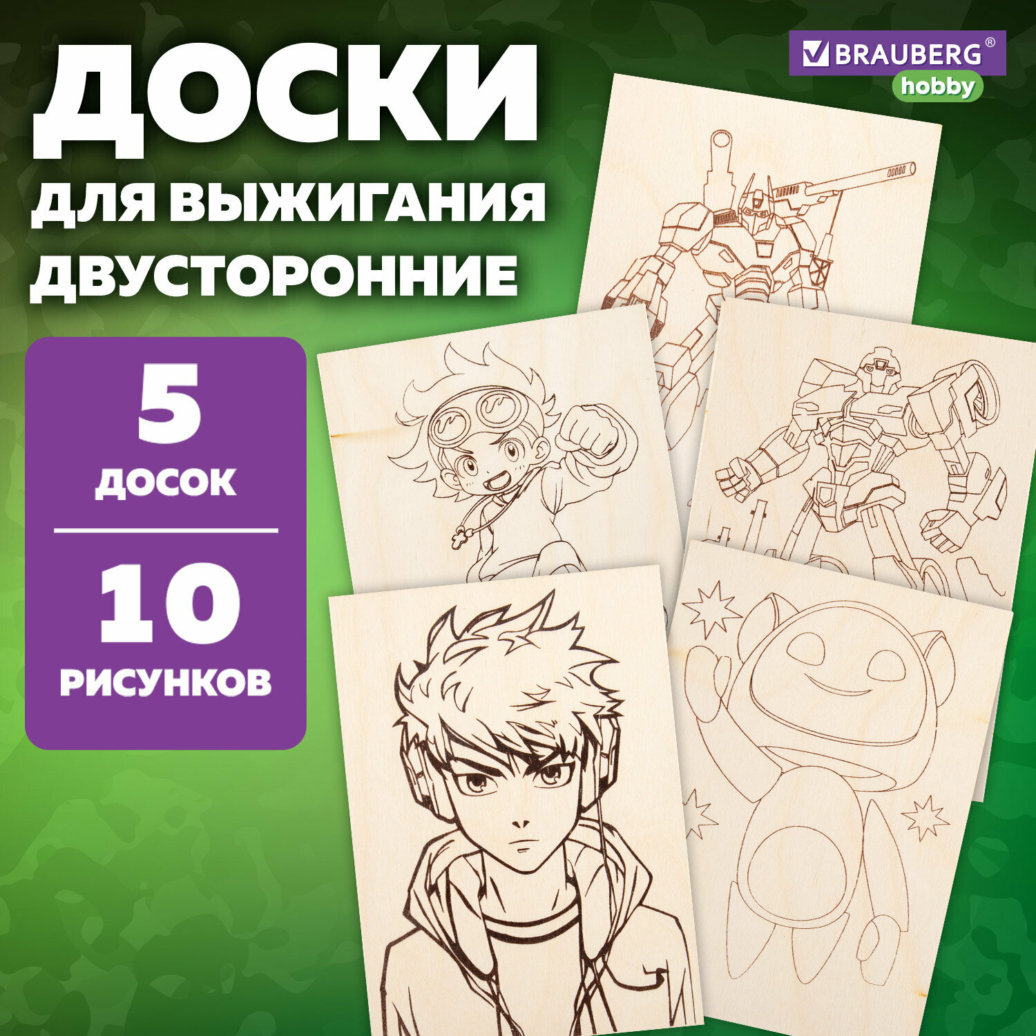 Набор для выжигания по дереву, деревянные заготовки для творчества Для мальчиков, 5 штук 10 рисунков, 15x21 см, Brauberg Hobby, 665310 интересное: