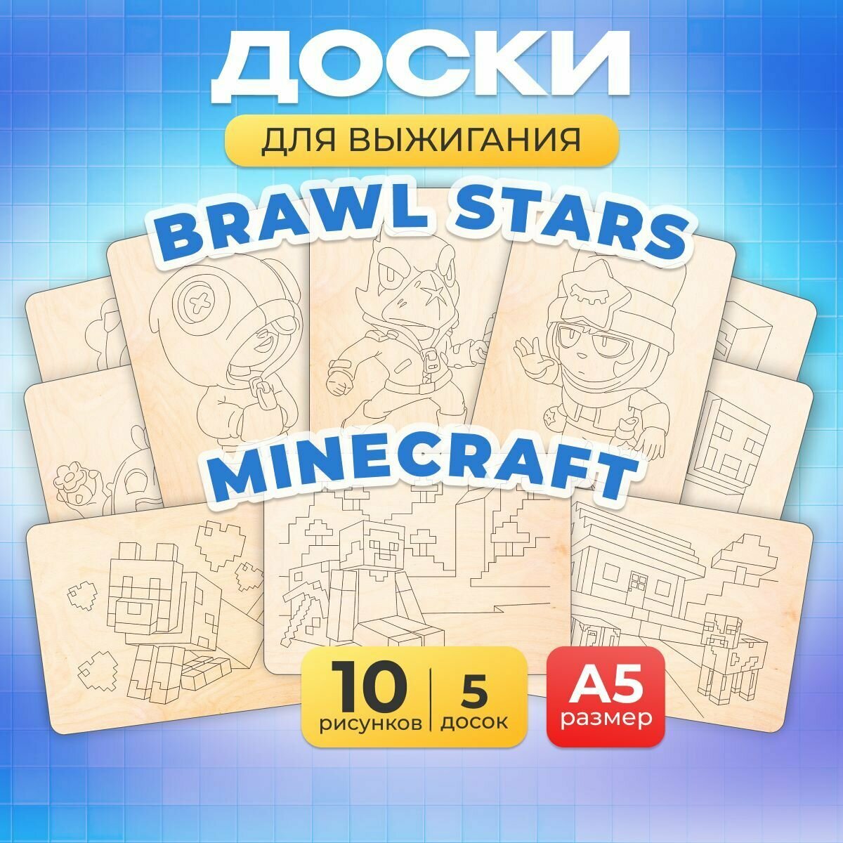 Набор деревянных досок из фанеры MEGA TOYS для выжигания по дереву с рисунком Minecraft и Brawl Stars интересное: