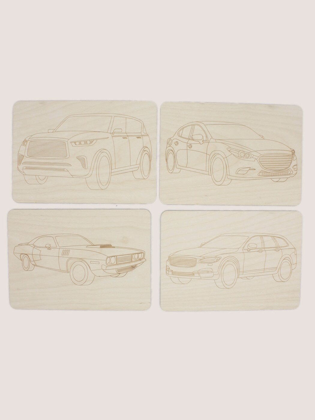Набор основ для выжигания по дереву, зенарта, доска для рисования, RiForm с рисунком "Машины №1", формат А5, фанера 4мм интересное: