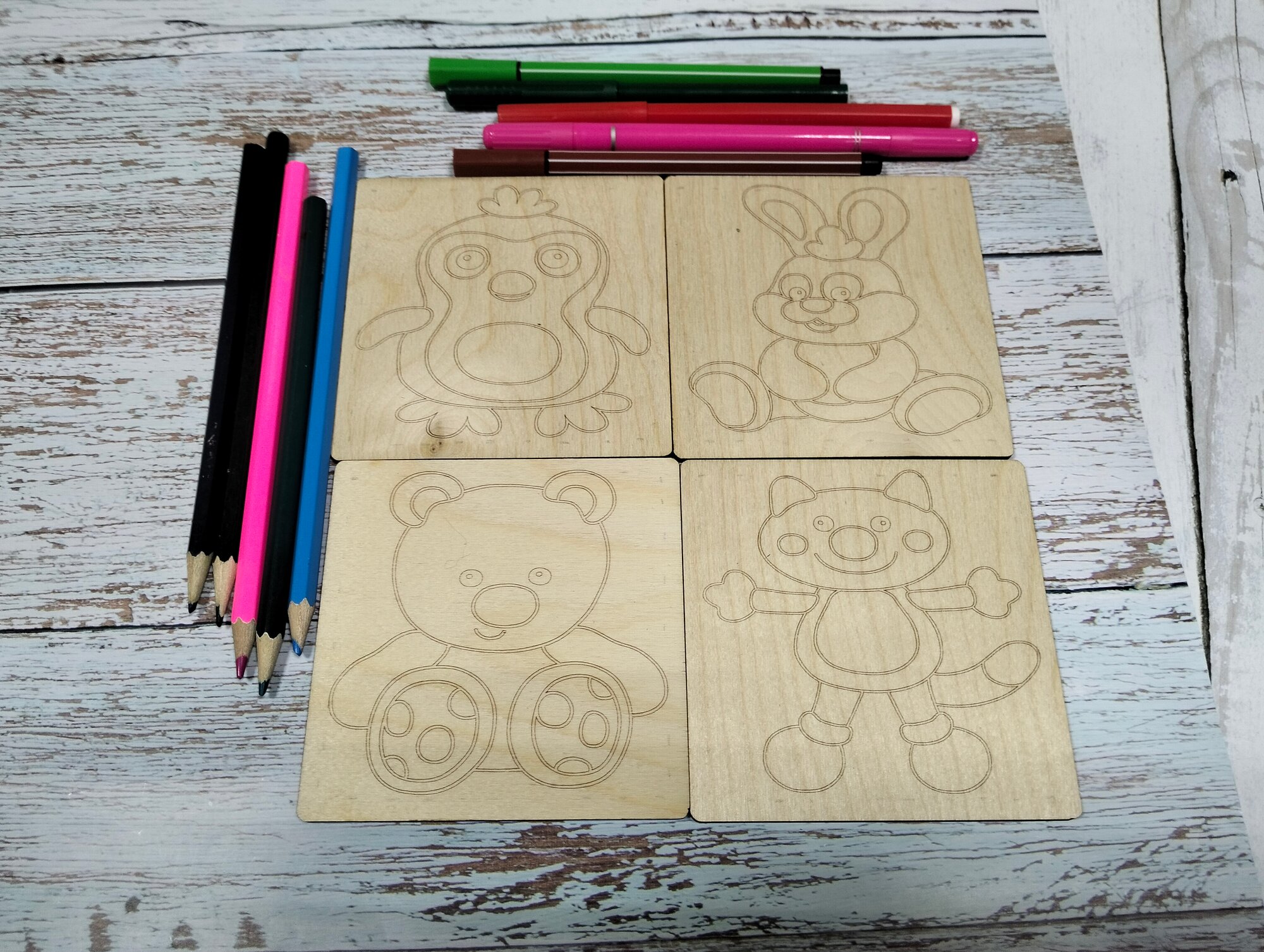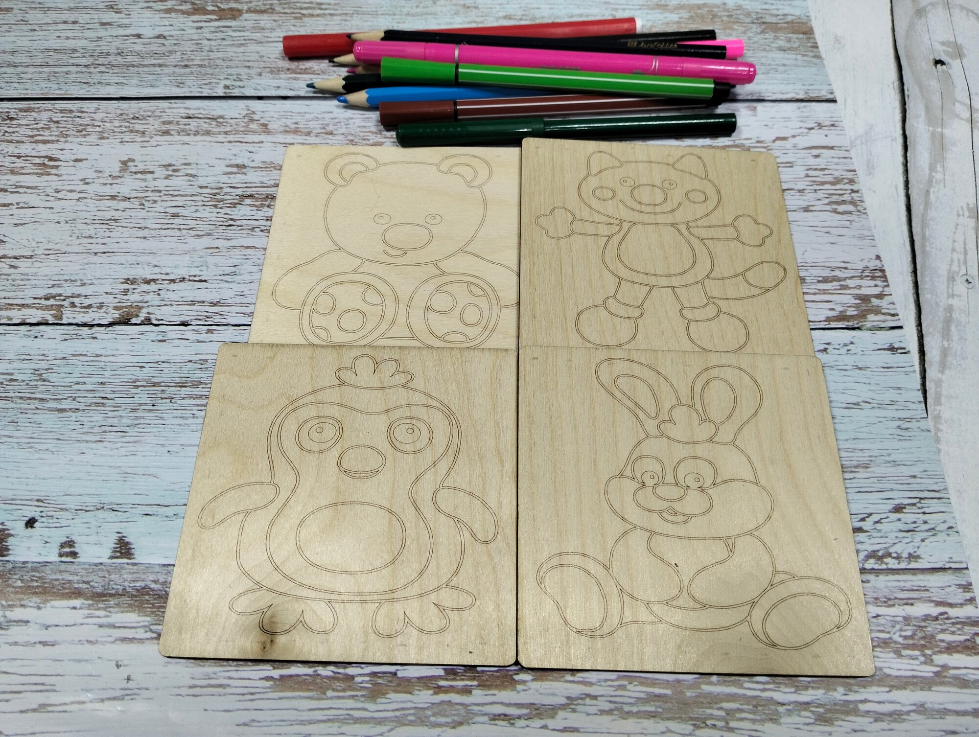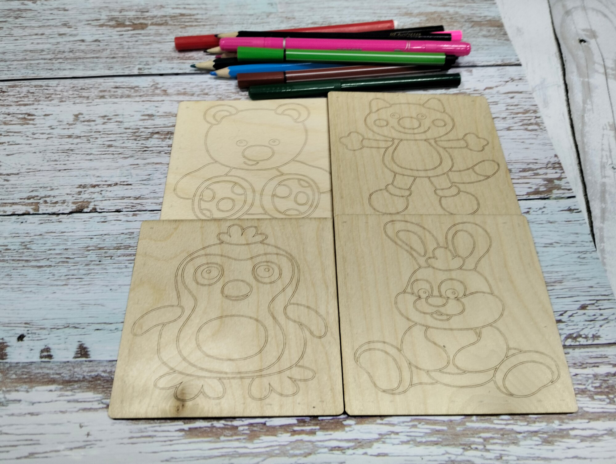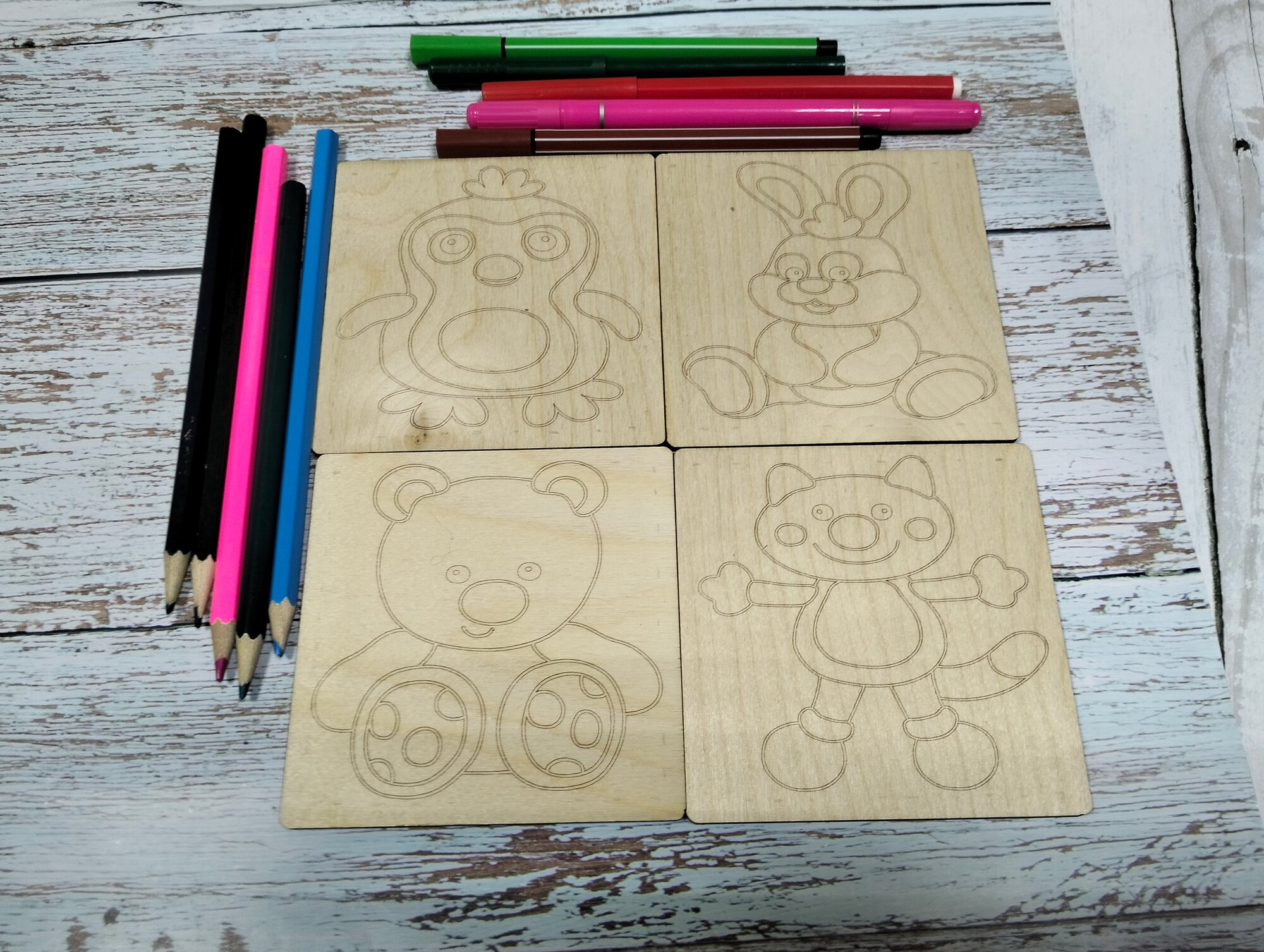 СохранитьНабор для раскрасок и выжигания, выжигание и раскрашивания по дереву."Зверюшки", 10х10 см, 4шт. интересное: