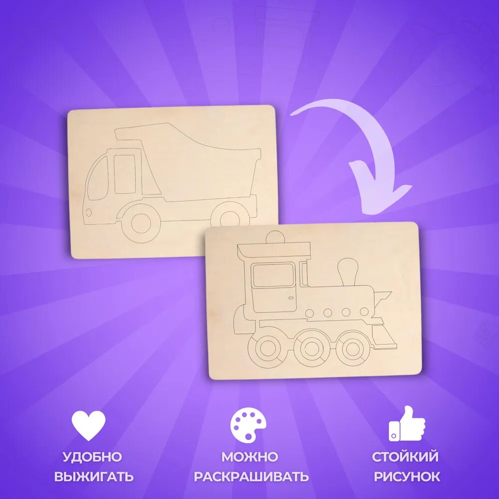 Набор деревянных досок А5 для рисования и выжигания по дереву детский из фанеры с рисунком Транспорт интересное: